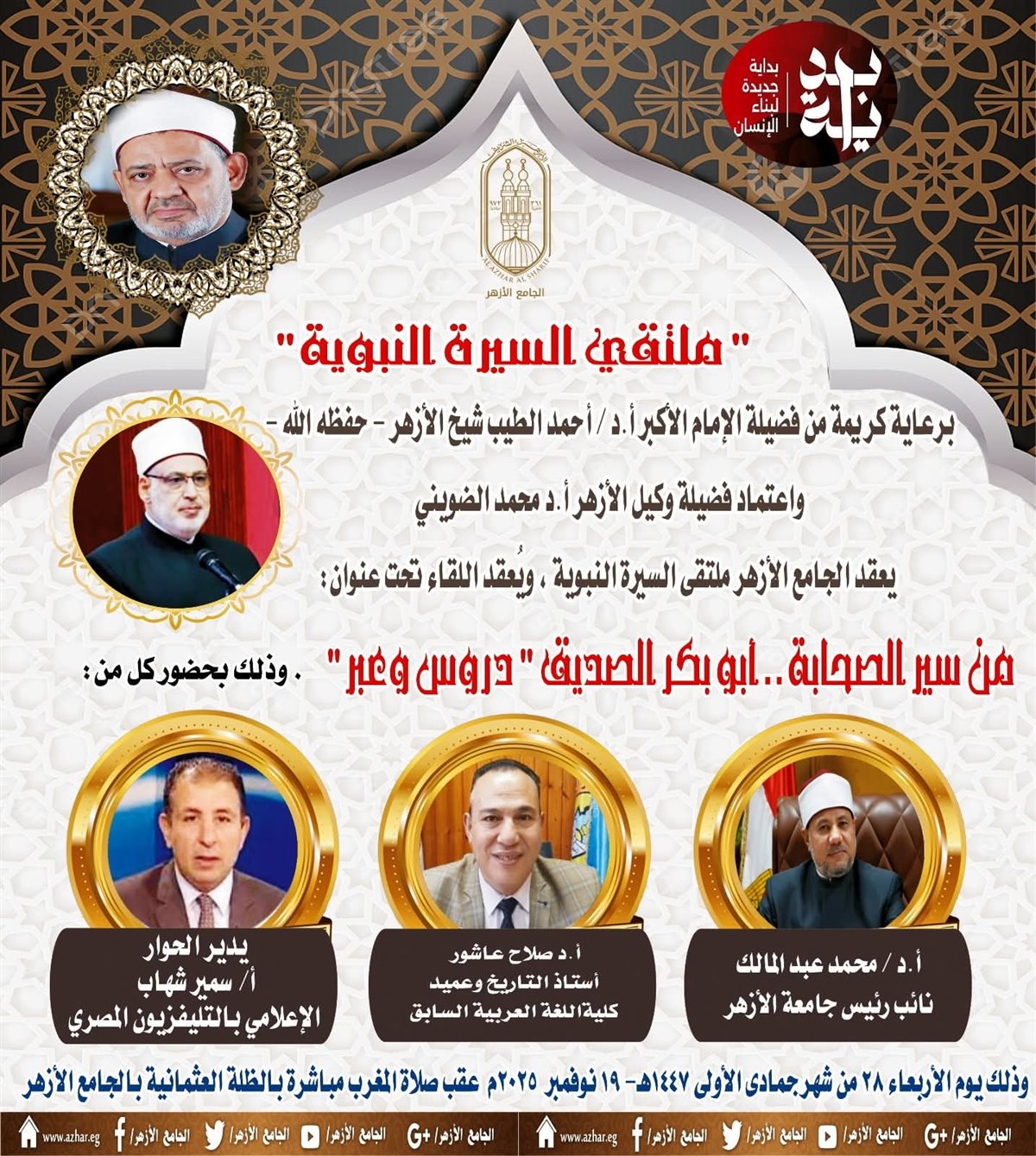 يعقد الجامع الأزهر غداً ملتقى السيرة النبوية السابع والثلاثون، والذي يناقش على مائدته: من سير الصحابة.. أبو بكر الصديق" دروس وعبر".