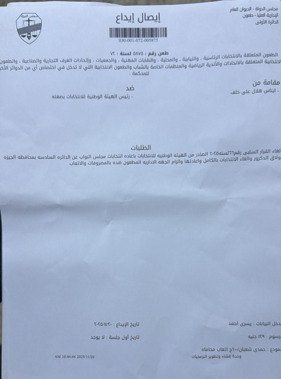 تقدّمت المرشحة إيناس هلال، المنافسة على مقعد مجلس النواب بدائرة بولاق الدكرور، بأول طعن رسمي ضد رئيس الهيئة الوطنية للانتخابات، وذلك بمقر مجلس الدولة، مطالبةً بإلغاء نتائج الانتخابات وإعادتها بالكامل داخل الدائرة.