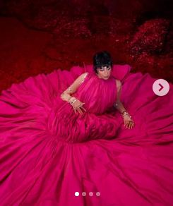 واعتمدت تسريحة شعر مختلفة لتتناغم مع إطلالتها اللافته ووضعت مكياجًا صاخبًا مرتكزًا على الألوان الترابية مع تحديد عينيها بالكحل والماسكرا السوداء ولون الكشمير في الشفاه.