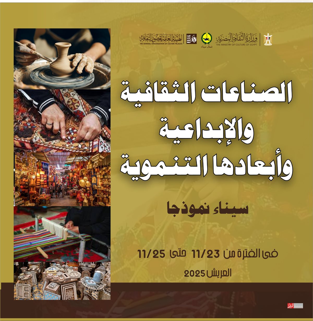يشهد قصر ثقافة العريش بمحافظة شمال سيناء، في السادسة مساء بعد غد الأحد، انطلاق فعاليات مؤتمر "الصناعات الثقافية والإبداعية وأبعادها التنموية.. سيناء نموذجا"، وذلك برعاية الدكتور أحمد فؤاد هنو، وزير الثقافة، واللواء دكتور خالد مجاور محافظ شمال سيناء، وتنظمه الهيئة العامة لقصور الثقافة، برئاسة اللواء خالد اللبان، في إطار برامج وزارة الثقافة لدعم الصناعات الثقافية والإبداعية.