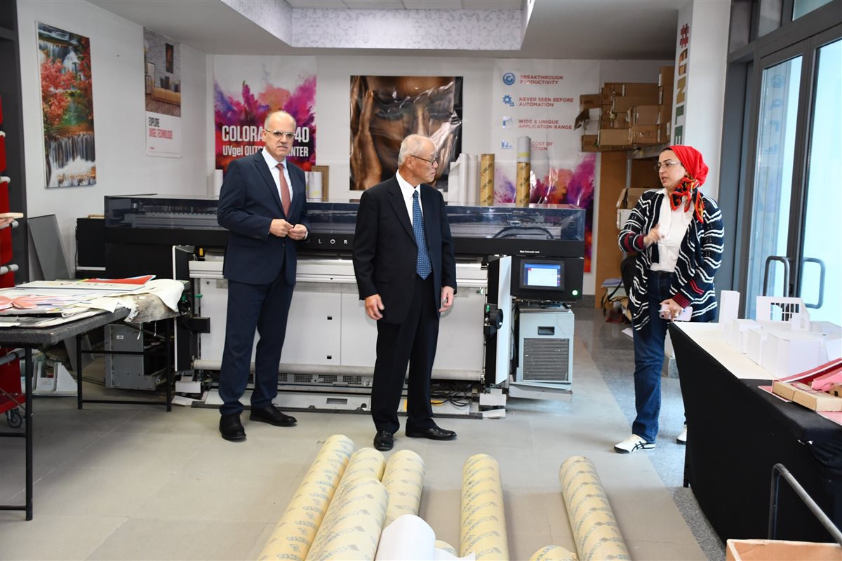 وعقب انتهاء المحادثات الثنائية، أجرى السفير إيواي جولة تفقدية داخل المركز المتكامل لخدمات الطباعة المقام بالجامعة بالتعاون مع شركة كانون اليابانية برفقة الدكتور ياسر حجازي، رئيس الجامعة.
