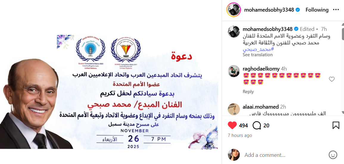 نشرت الصفحة الرسمية للفنان محمد صبحي، بوستر التكريم وأرفقته بتعليق: “وسام التفرد وعضوية الأمم المتحدة للفنان محمد صبحي للفنون والثقافة العربية”، وذلك عبر موقع تبادل الصور والفيديوهات “انستجرام”
