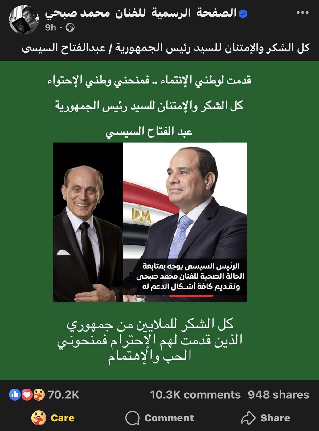 من جانبه، وجه الفنان القدير محمد صبحي جزيل الشكر للرئيس عبد الفتاح السيسي بعد تكليفه الدكتور خالد عبد الغفار، وزير الصحة بمتابعة حالته الصحية وتقديم كل وسائل الدعم والرعاية لحين الاطمئنان عليه.