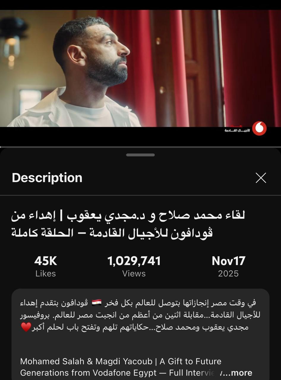 بهذا النجاح، يواصل اللقاء تحقيق انتشار واسع، ليؤكد مجددًا أن المحتوى القائم على القيمة الإنسانية والرسالة العميقة لا يزال يجد طريقه إلى قلوب الجمهور، وأن الجمع بين رمزين كبيرين مثل مجدي يعقوب ومحمد صلاح قادر على صناعة لحظة تُخلَّد لسنوات طويلة.