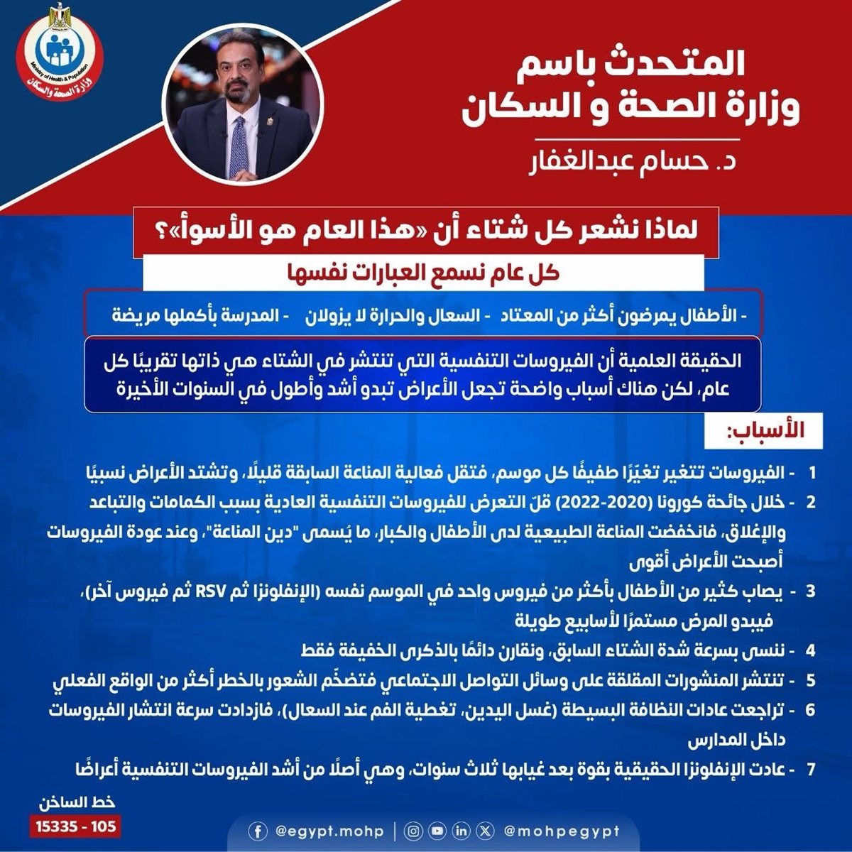 وقال “عبد الغفار” خلال منشور عبر حسابه الرسمي بموقع التواصل الإجتماعي “فيس بوك”: “كل عام نسمع العبارات نفسها: الأطفال يمرضون أكثر من المعتاد - السعال والحرارة لا يزولان - المدرسة بأكملها مريضة”، مشيرًا إلى أن الحقيقة العلمية وراء ذلك هي أن الفيروسات التنفسية التي تنتشر في الشتاء هي ذاتها تقريبا كل عام، لكن هناك أسباب واضحة تجعل الأعراض تبدو أشد وأطول في السنوات الأخيرة.