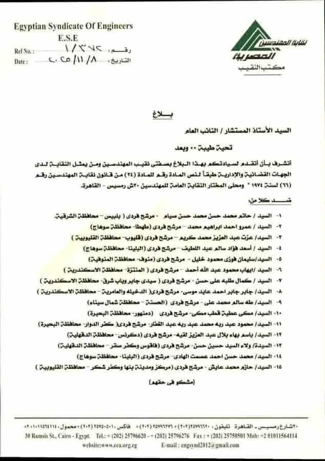 وطالب نقيب المهندسين، النائب العام بالتحقيق في الأمر؛ واتخاذ الإجراءات القانونية اللازمة ضد المشكو في حقهم.