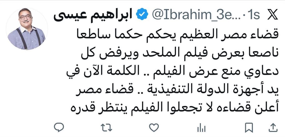 أعلن الإعلامي والكاتب إبراهيم عيسى عن رفض القضاء كل دعاوي منع عرض فيلم الملحد، وذلك خلال منشور عبر حسابه الشخصي بمنصة التغريدات المصغرة “إكس”.