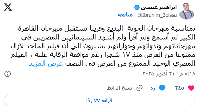 وكتب إبراهيم عيسى: “بمناسبة مهرجان الجونة البديع وقريبا نستقبل مهرجان القاهرة الكبير لم أسمع ولم أقرأ ولم أشهد السينمائيين المصريين في مهرجاناتهم وندواتهم وحواراتهم يشيرون الي أن فيلم الملحد لازال ممنوعا من العرض منذ ١٧ شهرا رغم موافقة الرقابة عليه”.