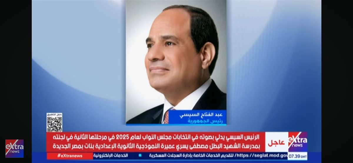 أفادت قناة "إكسترا نيوز" في نبأ عاجل، أن الرئيس عبدالفتاح السيسي أدلى بصوته في انتخابات مجلس النواب لعام ٢٠٢٥ في مرحلتها الثانية، في لجنته بمدرسة الشهيد البطل مصطفى يسري عميرة النموذجية الثانوية الإعدادية بنات بمصر الجديدة.