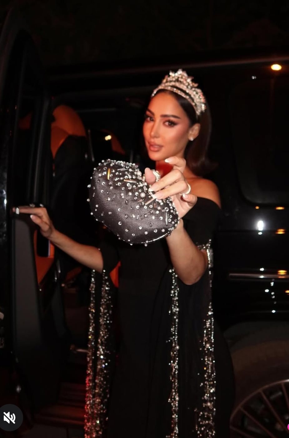 واعتمدت تسريحة شعر عفوية لتتزين بالتاج المرصع بحبيبات الالماس ووضعت مكياجا جذابًا مرتكزا على الألوان الترابية مع تحديد عينيها بالكحل والماسكرا مع لون الكشمير في الشفاه.