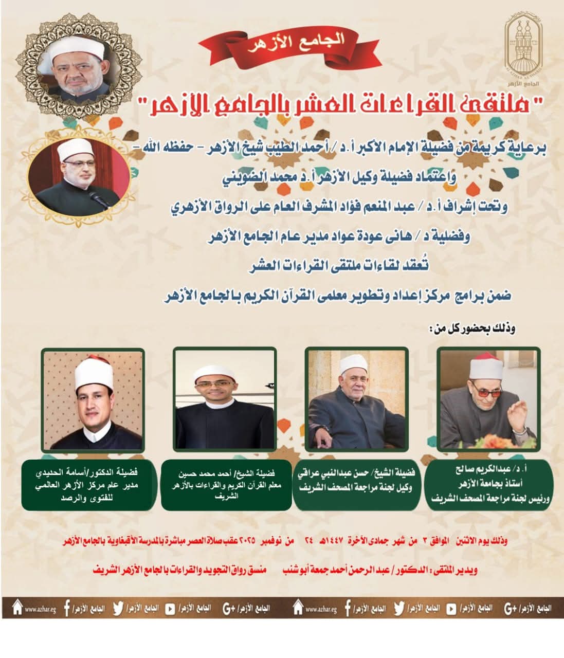 وصرح الدكتور عبد المنعم فؤاد المشرف العام على الأنشطة العلمية للرواق الأزهري بالجامع الأزهر، بأن هذا البرنامج يأتي ضمن سلسلة من الأنشطة والبرامج التي ينظمها مركز إعداد وتطوير معلمي القرآن الكريم بالجامع الأزهر، ويهدف إلى قراءة القرآن الكريم برواية الإمام قالون عن الإمام نافع المدني، وذلك بعد الانتهاء من ختمتين الأولى بالقراءات السبع، والثانية بالقراءات الثلاثة المتممة للعشر، بواقع نصف جزء يومياً، مع تقديم شرح مفصل للتلاوة وتعريف بأصول القراء ومذاهبهم، كما سيتناول الملتقى التنبيه على الكلمات الفرشية المختلف فيها بين القراء، مما يسهم في تعزيز الفهم العميق للقراءات العشر المتواترة ورفع مستوى التلاوة بين المشاركين.
