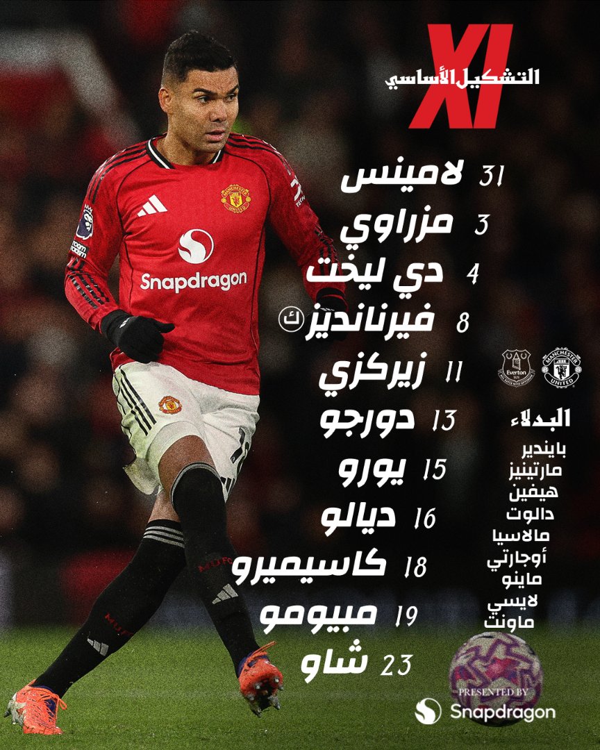 التشكيل الرسمي لمباراة مانشستر يونايتد وإيفرتون