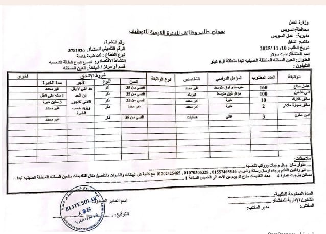 وزارة العمل تعلن توفير 275 فرصة عمل جديدة لأبناء محافظة السويس بشركة “إيليت سولار”
