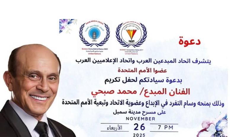 على صعيد آخر، أعلنت الصفحة الرسمية للفنان محمد صبحي عن حصوله على وسام التفرد وعضوية الأمم المتحدة من اتحاد المبدعين العرب واتحاد الإعلاميين العرب، تقديرًا لمشواره الفني الكبير، على أن يتسلمه يوم الأربعاء المقبل في تمام السابعة مساءً.