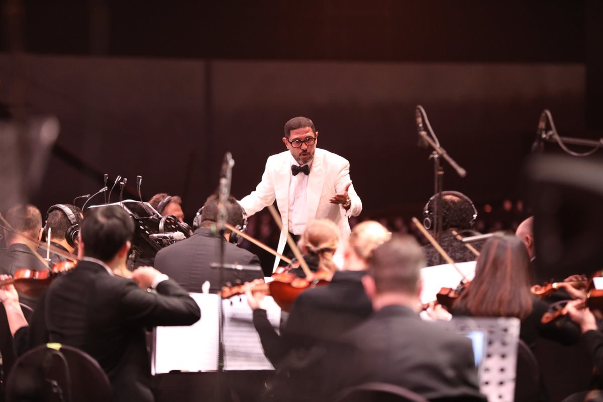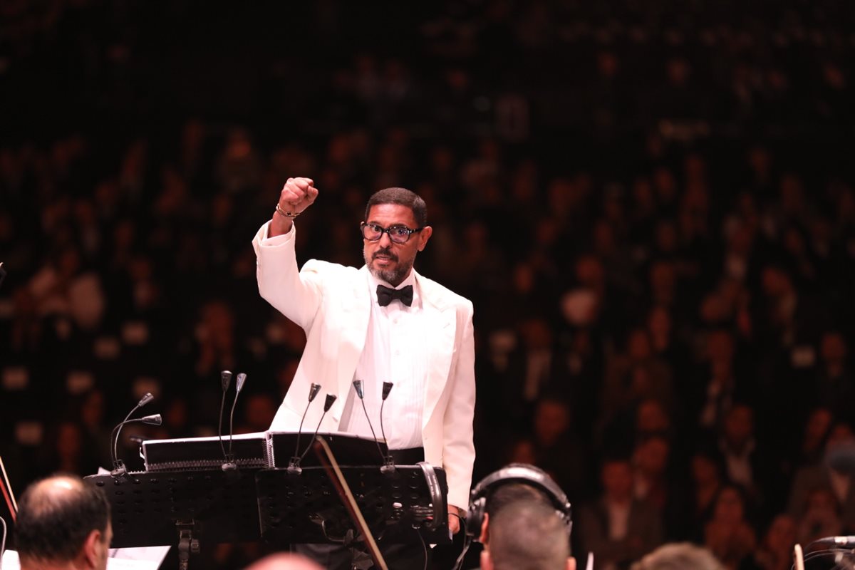 هاني فرحات يقود الأوركسترا الملكي البريطاني في حفل كامل العدد بالأهرامات.. صور