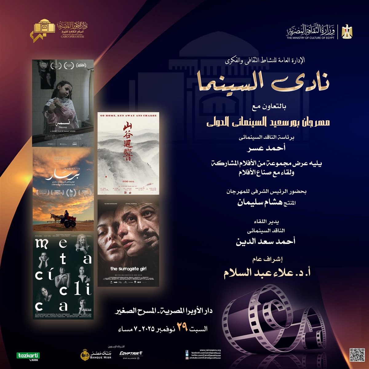 تدعوكم وزارة الثقافة المصرية لحضور فعالية نادي السينما، بالتعاون مع مهرجان بورسعيد السينمائي الدولي، عرض مجموعة من الأفلام المشاركة ضمن فعاليات مهرجان بورسعيد.