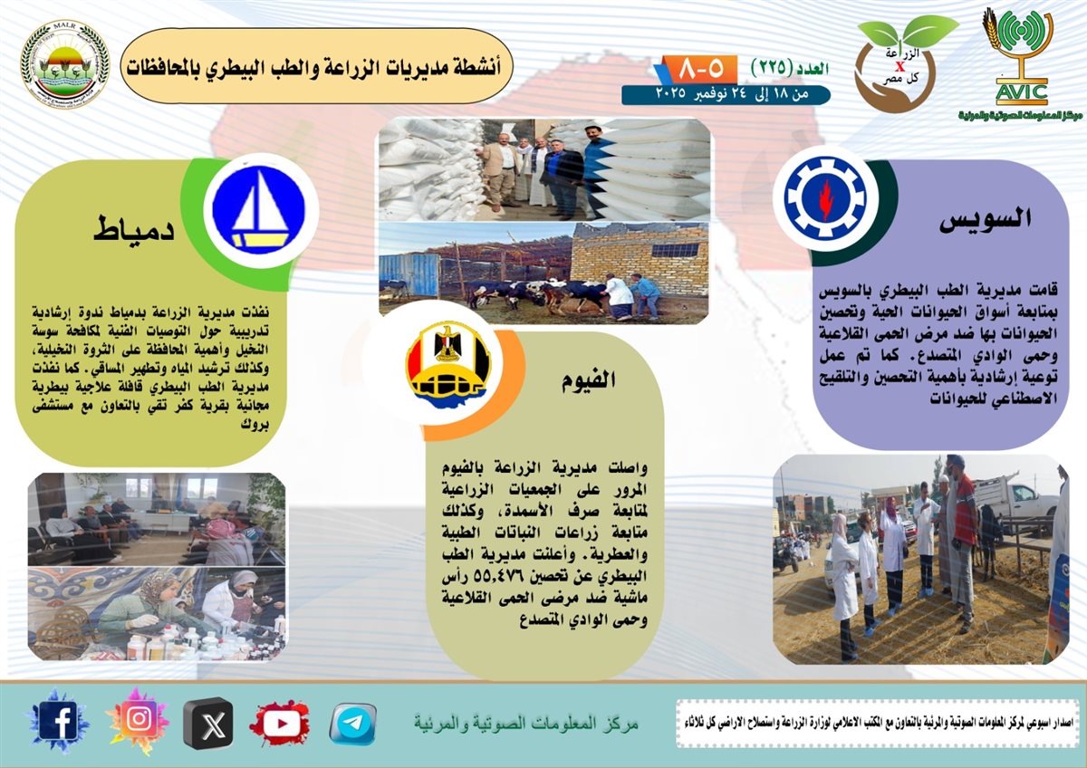 أصدر مركز المعلومات الصوتية والمرئية التابع لوزارة الزراعة واستصلاح الأراضي، والمكتب الاعلامي للوزارة، العدد رقم 225 من اصدار: "الزراعة في كل مصر" بالانفوجراف والفيديو، يوضح الجهود والانشطة التي تقوم بها مديريات الزراعة والطب البيطري بمحافظات الجمهورية خلال الفترة من 18 إلى 24 نوفمبر الجاري