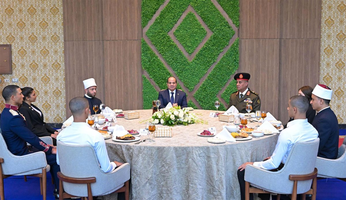 وذكر المتحدث الرسمي أن الرئيس قد تناول وجبة الغداء مع مدير الأكاديمية العسكرية المصرية، ومديري الكليات العسكرية، ووزير الأوقاف، والطلبة الدارسين بالأكاديمية، حيث دار نقاش تفاعلي بين السيد الرئيس وطلبة الأكاديمية، أشار خلاله السيد الرئيس إلى أنه يمكن للطلبة المؤهلين من الإناث والذكور الالتحاق بكلية الطب العسكري سواء بالصفة العسكرية أو بالصفة المدنية، معاودًا سيادته طمأنة أسر الطلبة بأن الأمور تدار في الكلية بشكل محكم ومدروس وفقا لأعلى المعايير. كما أكد السيد الرئيس على أهمية الاهتمام بنشر ثقافة الرياضة، خاصة فيما بين النشء، كما أعرب سيادته عن الانفتاح لأي اقتراح إيجابي وقابل للتنفيذ ينطوي على مشاركة اتحادات الطلاب بالجامعات في كافة المسائل المتعلقة بالشباب واتخاذ القرارات ذات الصلة.