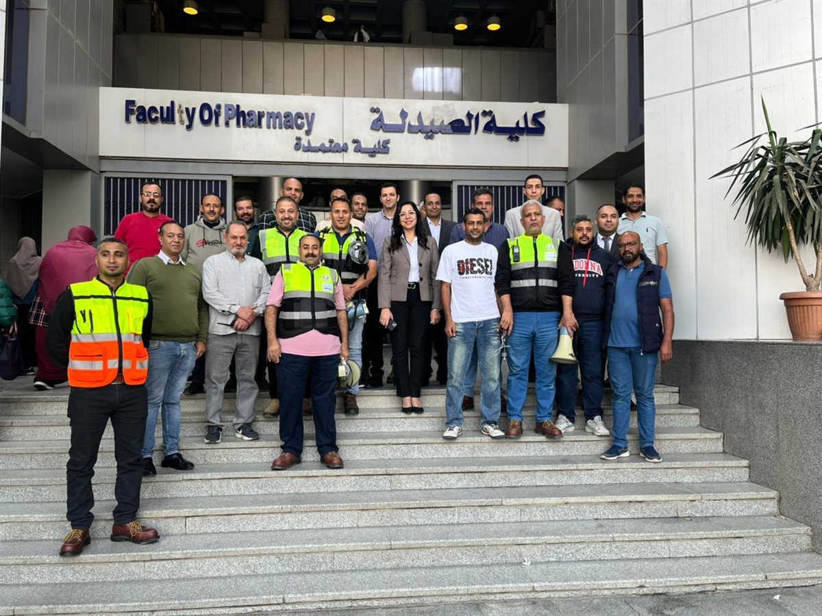 نظم قطاع شؤون خدمة المجتمع وتنمية البيئة بكلية الصيدلة جامعة عين شمس تجربة إخلاء طارئة ناجحة لمبنى الكلية.