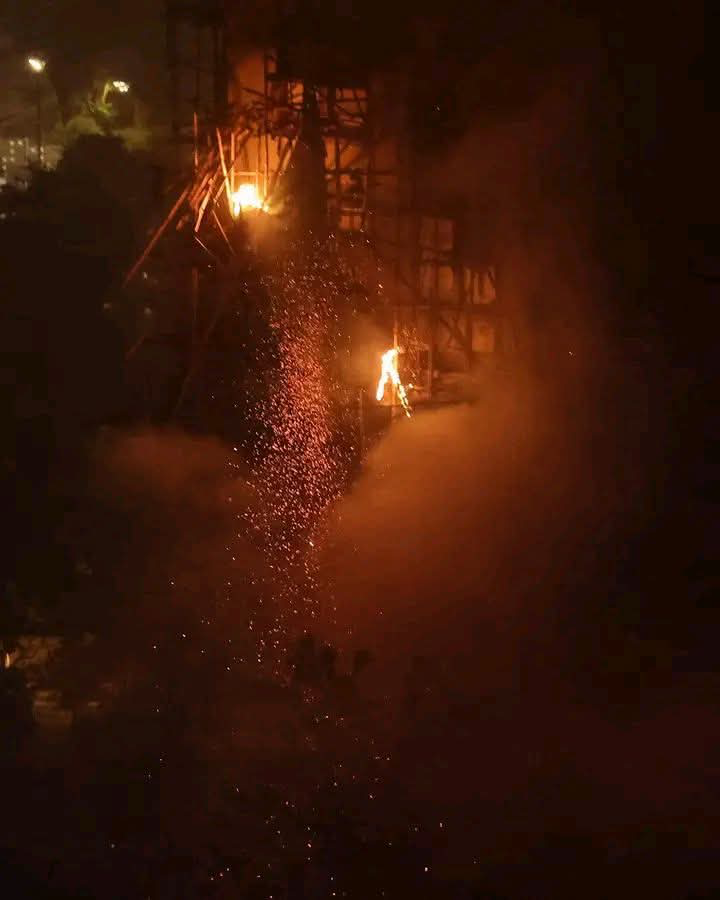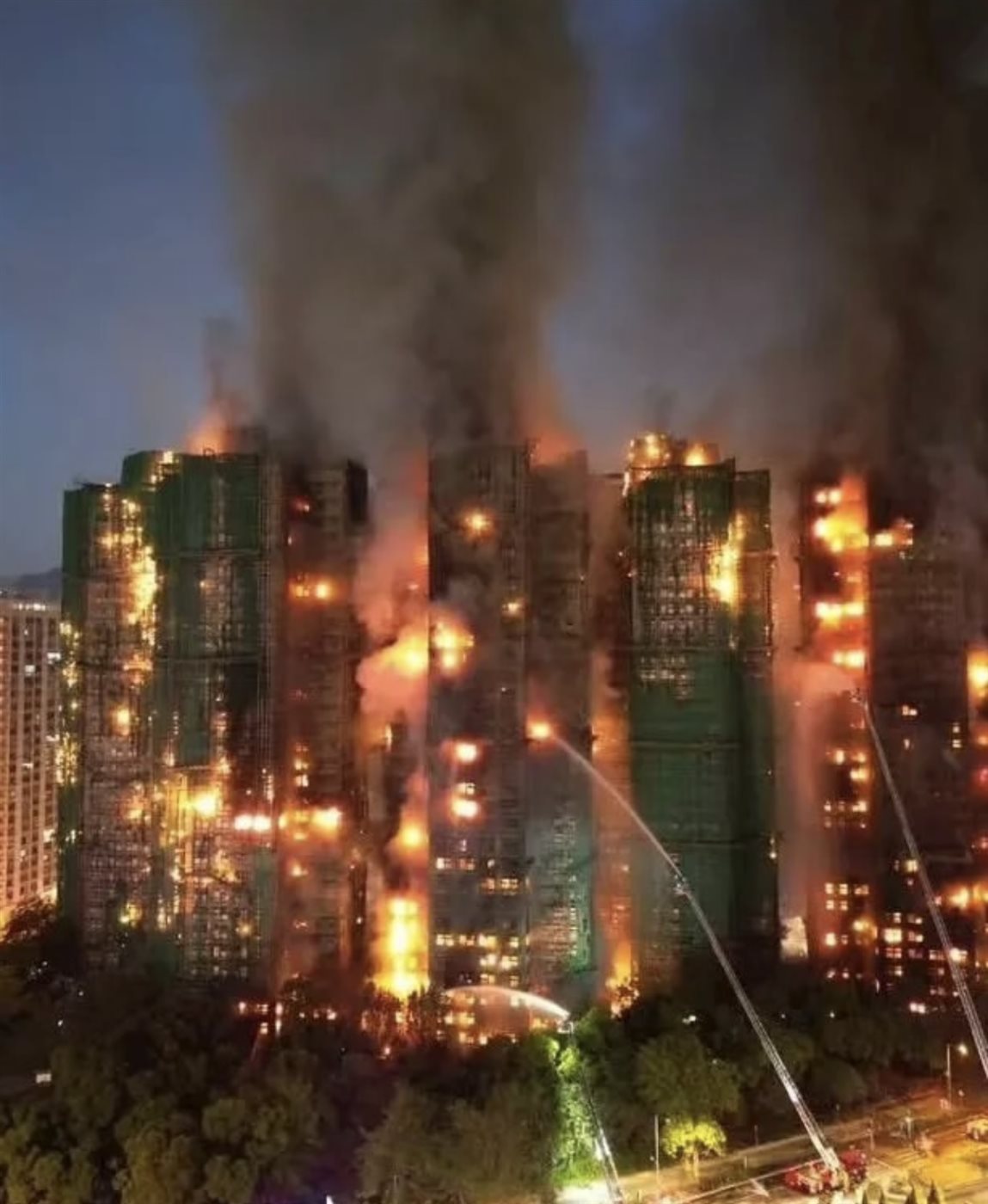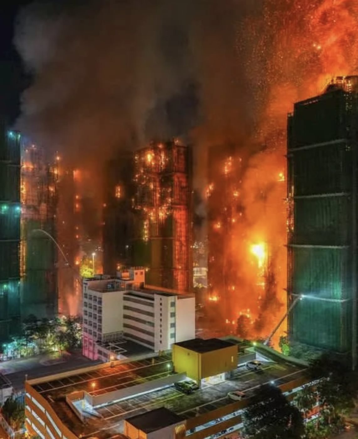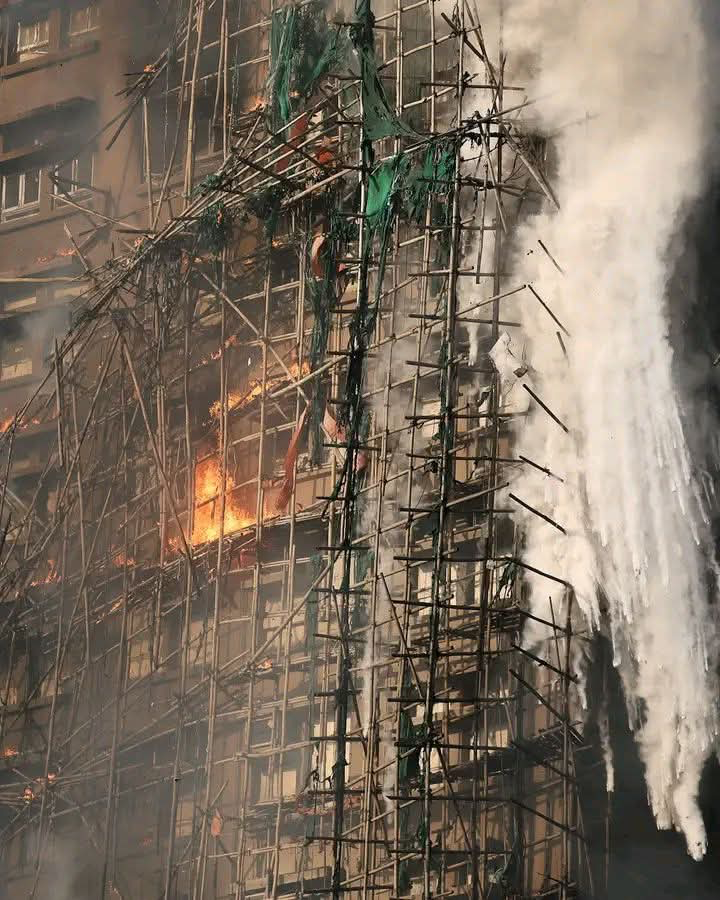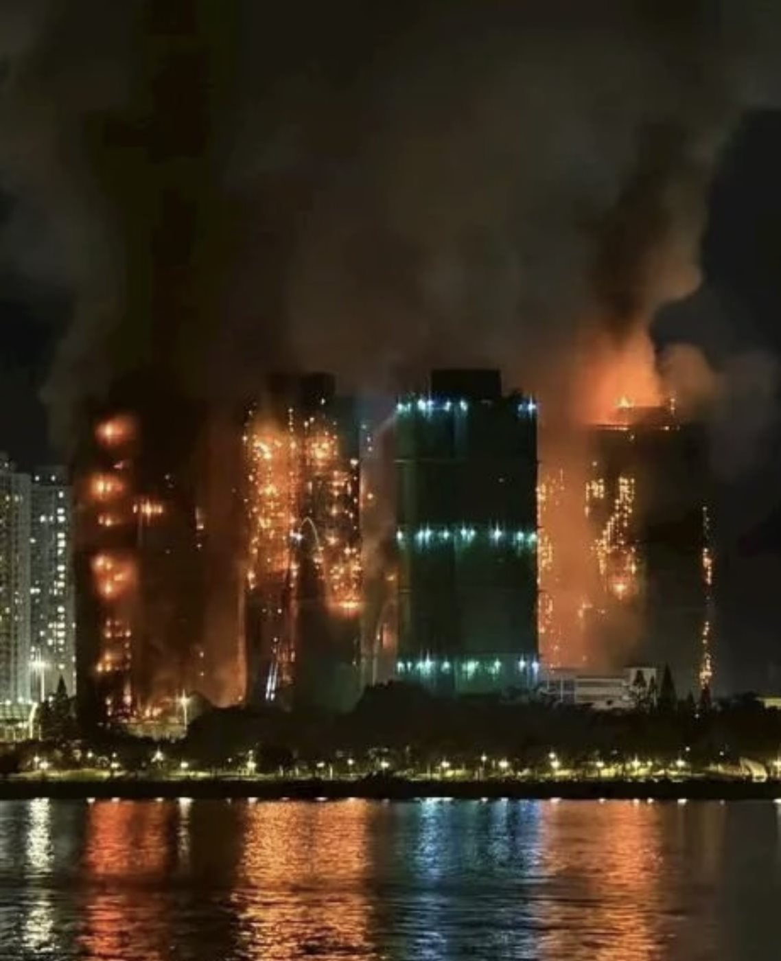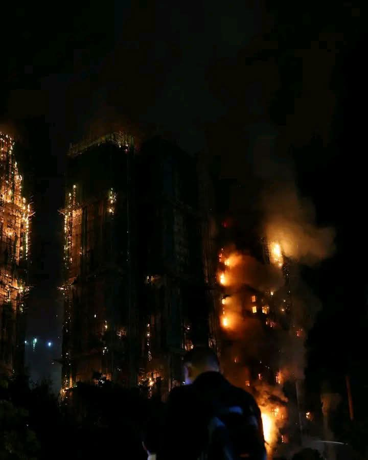 ووفقًا لما نقلته وسائل إعلام محلية، لا يزال عدد من السكان محاصرين داخل الأبراج، كما ذكرت السلطات أن الحريق اندلع في سقالات من الخيزران مستخدمة لأعمال الصيانة قبل أن يمتد إلى أجزاء من 5 مبانٍ على الأقل داخل المجمع، وسط أعمدة كثيفة من اللهب والدخان شوهدت تتصاعد من الموقع.