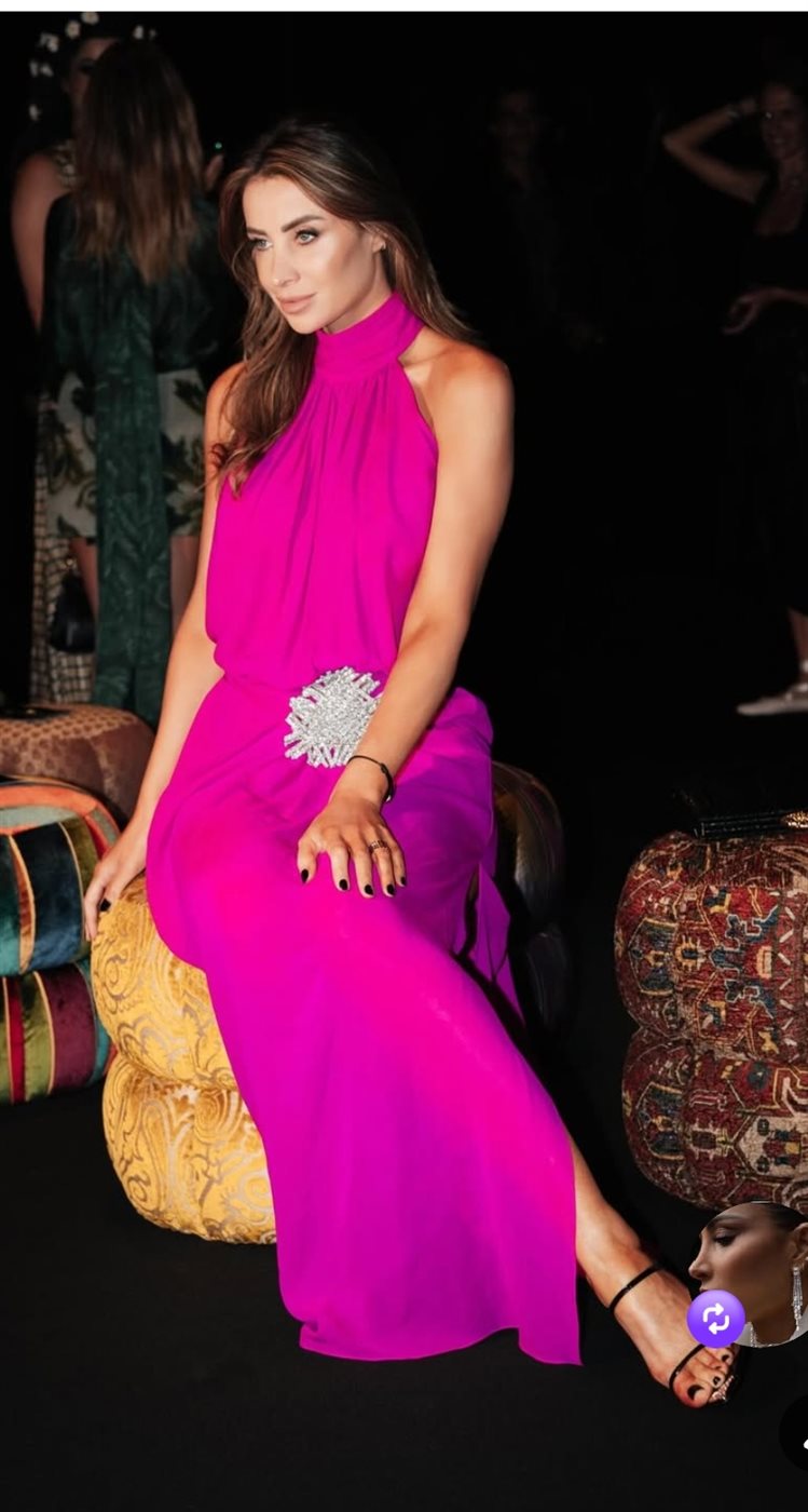 وظهرت أنابيلا هلال بإطلالة أنوثية مفعمة الأنوثة والجاذبية في آن واحد، مرتديه فستان طويل فضفاض اتسم بشق أظهر احد ساقيها بشكل لافت، صمم الفستان من قماش الحرير باللون الفوشيا الفاقع وزين ببعض حبيبات اللؤلؤ والكريستال من الأمام، فيما انتعلت صندلا بكعب عال.