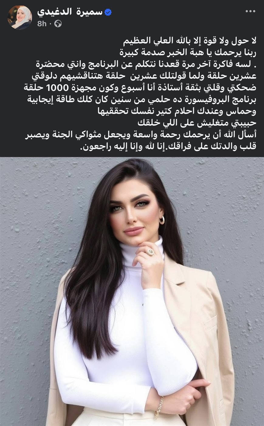 كتبت سميرة الدغيدي: “لا حول ولا قوة إلا بالله العلي العظيم ربنا يرحمك يا هبة الخبر صدمة كبيرة. لسه فاكرة آخر مرة قعدنا نتكلم عن البرنامج وانتي محضّرة عشرين حلقة ولما قولتلك عشرين حلقة هتناقشيهم دلوقتي ضحكتي وقلتي بثقة أستاذة أنا أسبوع وكون مجهزة 1000 حلقة”.