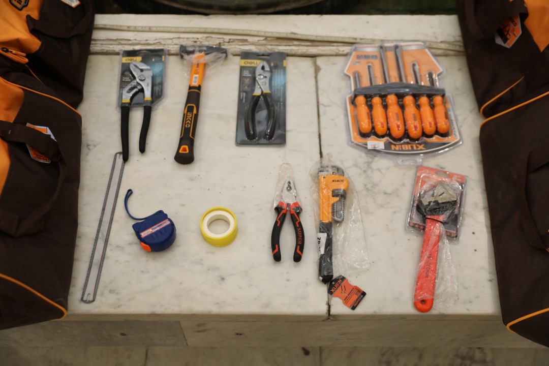 وتضمنت الحقائب المقدمة ادوات عملية تشمل مفكات ومفاتيح وزراديات ومتر وشاكوش وبكرة تفلون لتمكين المتدربين من تنفيذ مهام الصيانة اليومية بكفاءة.