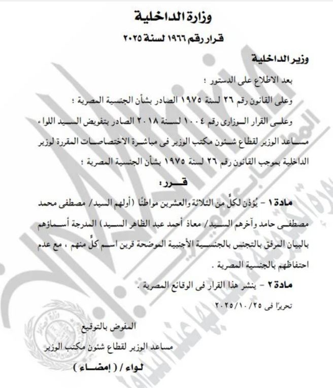 نشرت الجريدة الرسمية قرار وزارة الداخلية رقم 1966 لسنة 2025، بالإذن لـ23 مواطنا بالتجنس بالجنسية الأجنبية مع عدم احتفاظهم الجنسية المصرية.