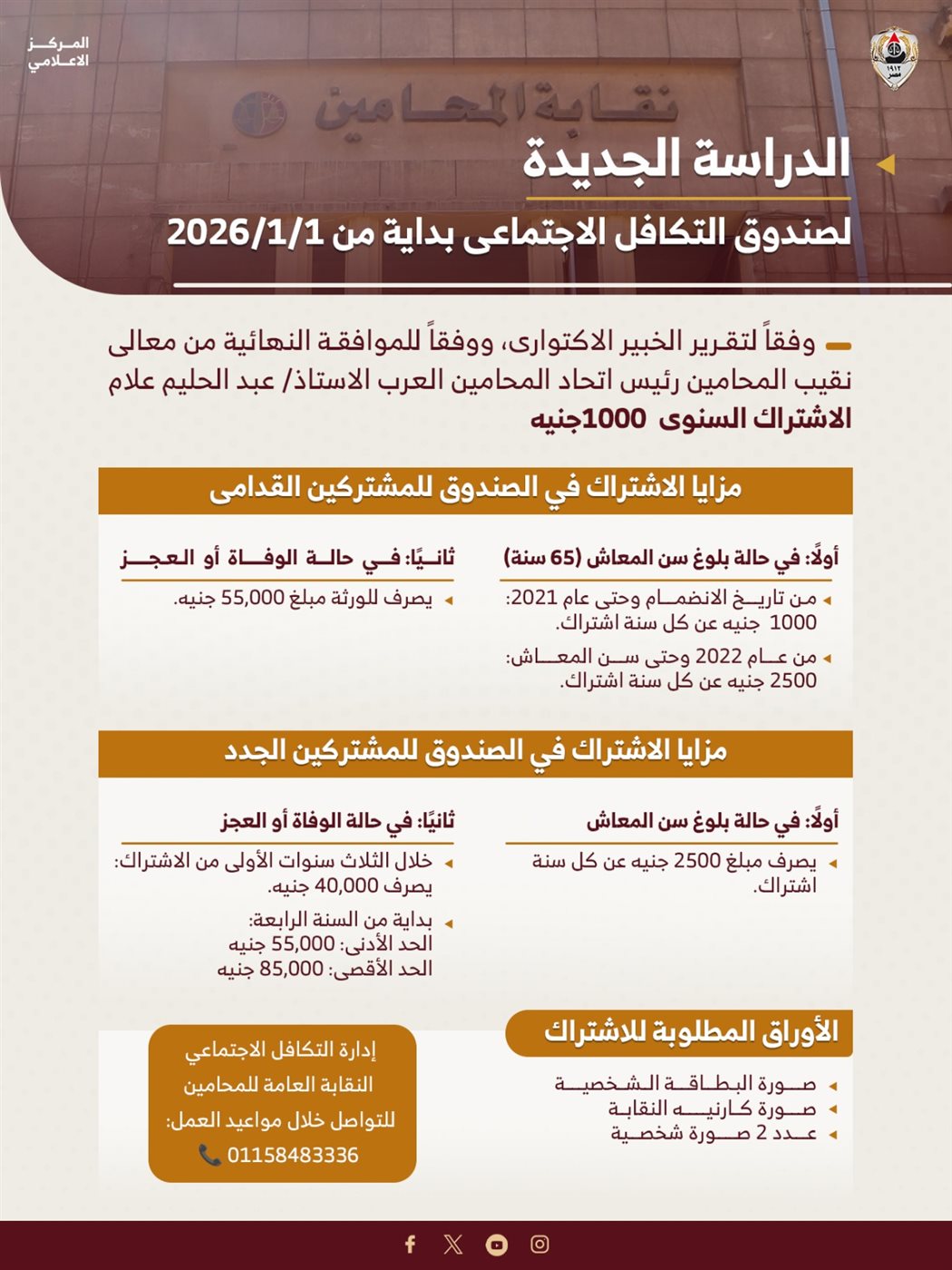 في إطار حرص نقابة المحامين على تعزيز منظومة الحماية الاجتماعية ودعم أعضائها، يبدأ العمل بالدراسة الجديدة لصندوق التكافل الاجتماعي اعتبارًا من 1 يناير 2026، وذلك استنادًا إلى تقرير الخبير الاكتواري والموافقة النهائية من عبد الحليم علام، نقيب المحامين ورئيس اتحاد المحامين العرب.