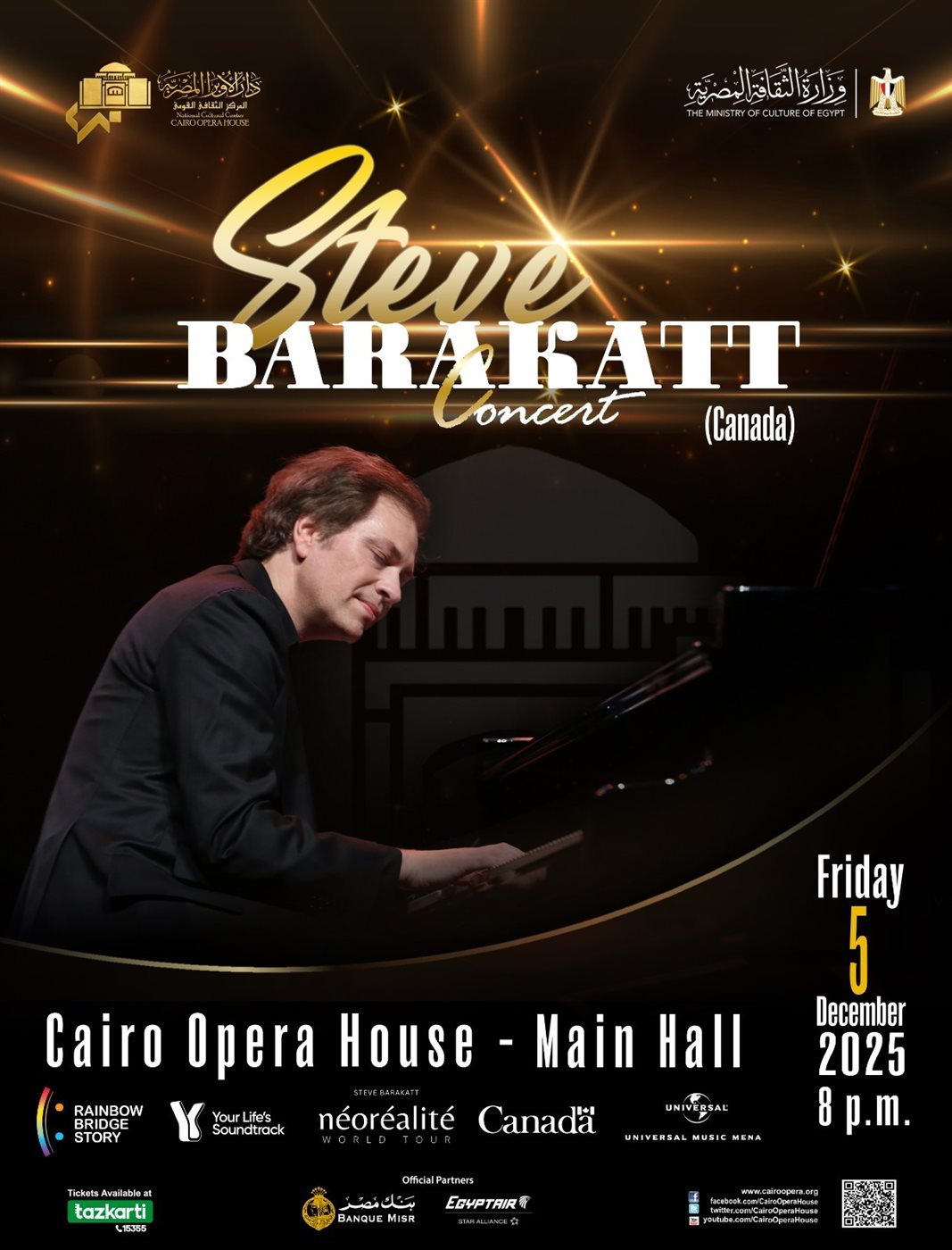 احتفالاً بمرور 71 عاماً على العلاقات الدبلوماسية بين كندا ومصر، تقيم وزارة الثقافة المصرية ودار الأوبرا المصرية حفلاً موسيقياً للمؤلف وعازف البيانو الكندي- اللبناني ستيف بركات في دار الأوبرا المصرية، ضمن جولته العالمية "Néoréalité" التي حصدت إشادات واسعة النطاق، وذلك نهار الجمعة الواقع فيه 5 كانون الأول- ديسمبر الحالي.
