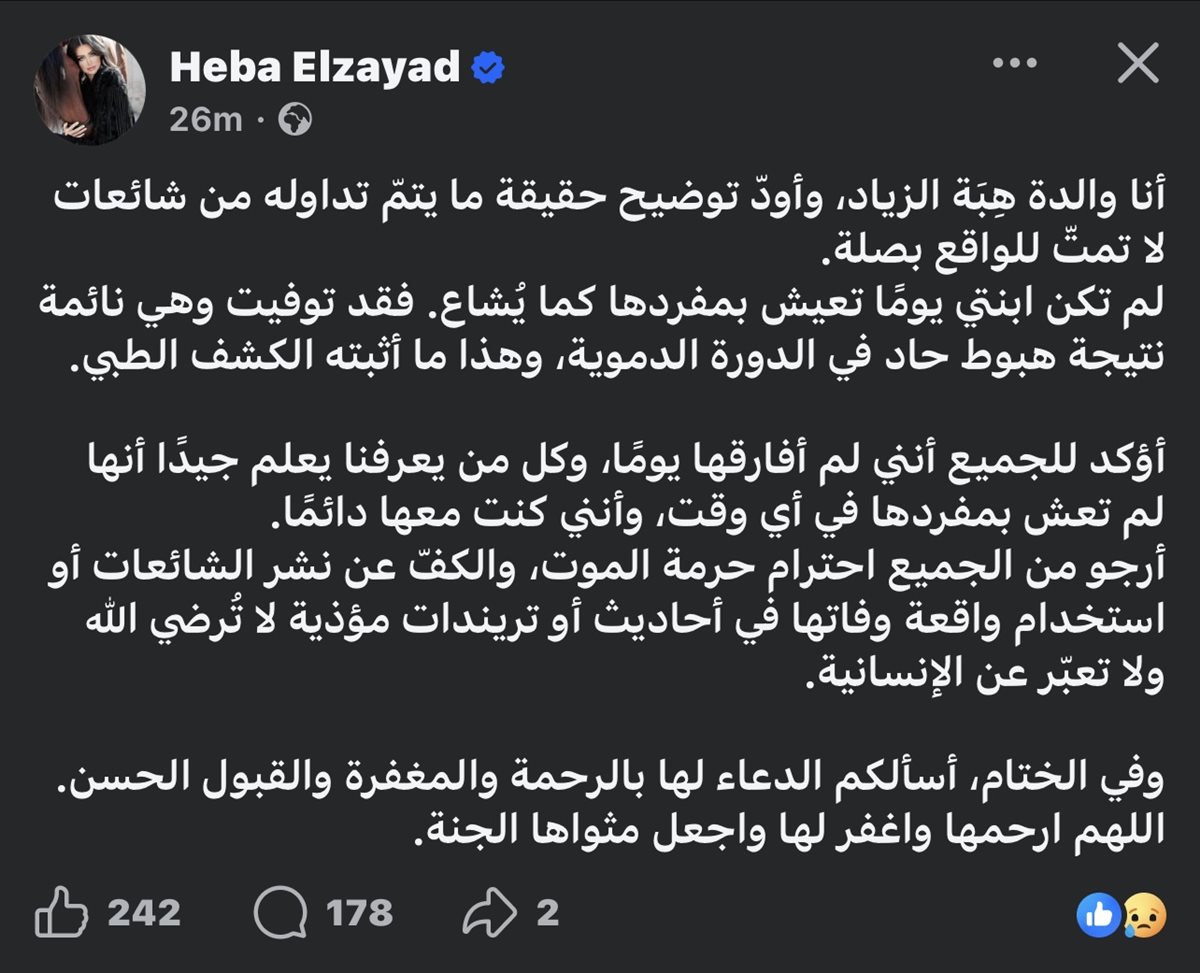 نفت والدة هبة الزياد كل الشائعات التي انتشرت مؤخرًا بعد وفاتها وتفيد بوجود خلافات بين الفقيدة وبين والدتها اضطرتها للعيش بمفردها، وذلك من خلال منشور عبر حسابها الرسمي بموقع التواصل الإجتماعي الأشهر “فيس بوك”.