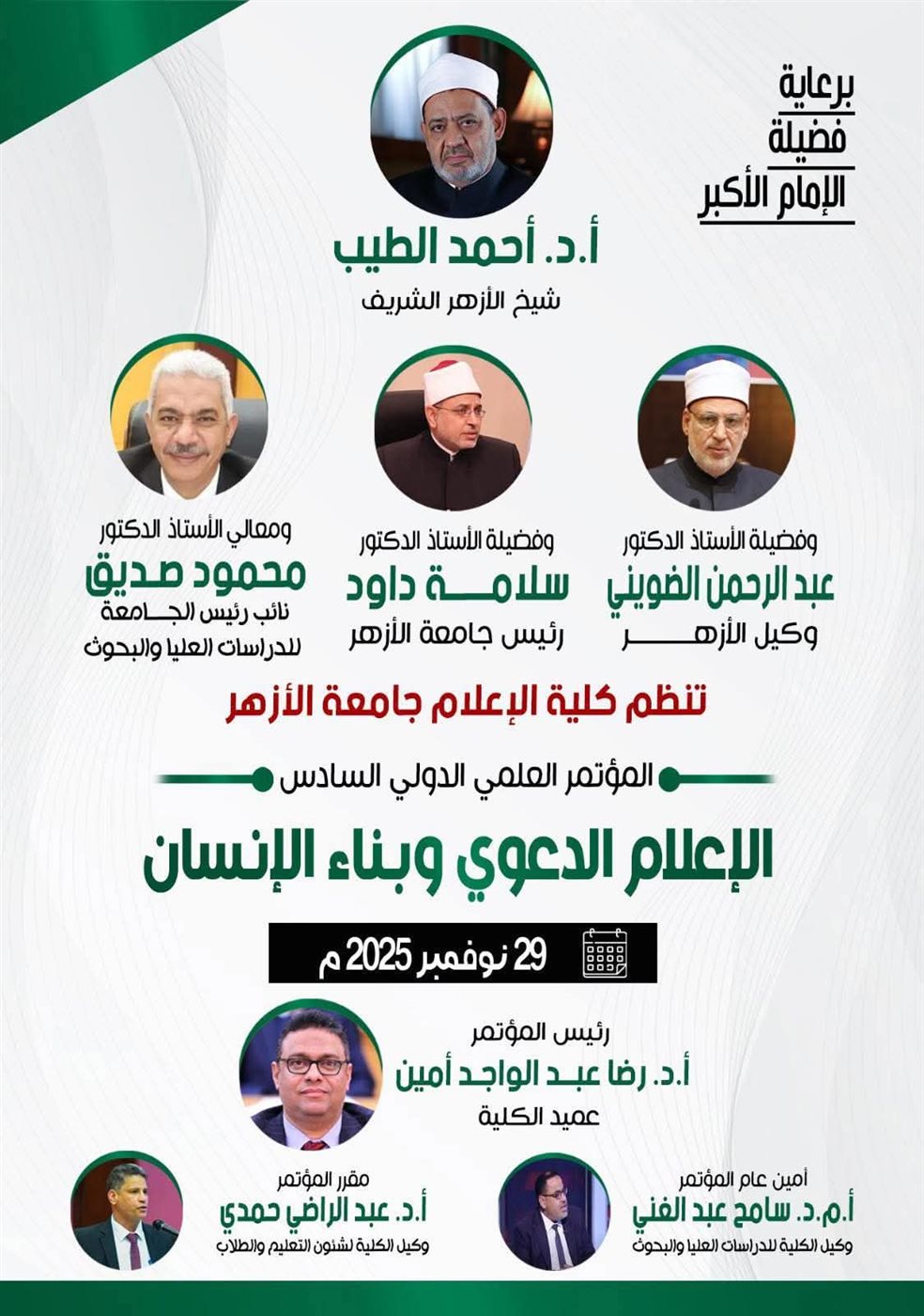 تعقد كلية الإعلام للبنين بالقاهرة غدًا السبت 29 من نوفمبر 2025م مؤتمرها الدولي السادس تحت عنوان: «الإعلام الدعوي وبناء الإنسان»، برعاية كريمة من الإمام الأكبر الدكتور أحمد الطيب، شيخ الأزهر الشريف، والدكتور محمد عبد الرحمن الضويني، وكيل الأزهر الشريف، وفضيلة الدكتور سلامة داود، رئيس جامعة الأزهر، والدكتور محمود صديق، نائب رئيس الجامعة للدراسات العليا والبحوث، وبحضور عدد من القيادات الدينية والأكاديمية، ونخبة من الباحثين والإعلاميين، وذلك في قاعة الفسطاط بمركز الأزهر الدولي للمؤتمرات بمدينة نصر.