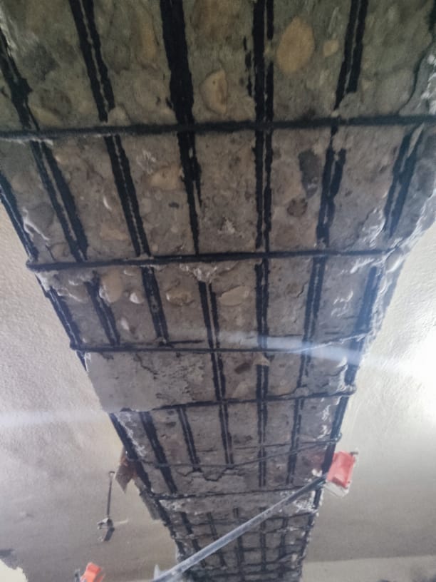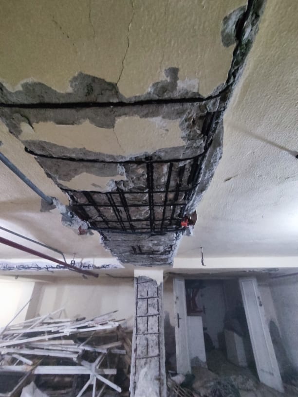 وتؤكد الصور التي وثقت مراحل العمل تقدما ملحوظا في العمليات المسندة للمقاول، حيث أظهرت الصور إزالة شاملة للخرسانة التالفة من الأعمدة والكمرات، وكشف شامل لحديد التسليح تمهيدا لعمليات المعالجة والتدعيم.