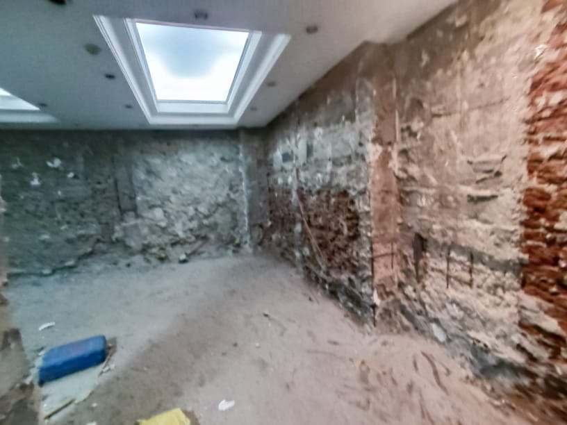 وجود مناطق بدأ فيها الترميم حيث تظهر الأسطح الخرسانية وقد تم معالجتها بالكامل، مما يعكس البدء في تنفيذ خطة التدعيم الإنشائي التي أوصت بها التقارير الهندسية الرسمية.