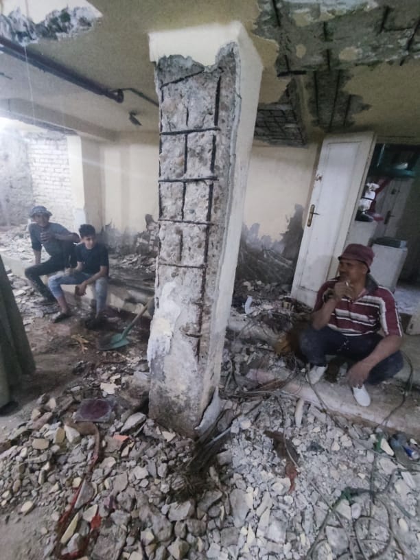 تراكم أنقاض الهدم في الموقع، مما يدل على استمرار أعمال التكسير وإزالة الأجزاء غير الصالحة.