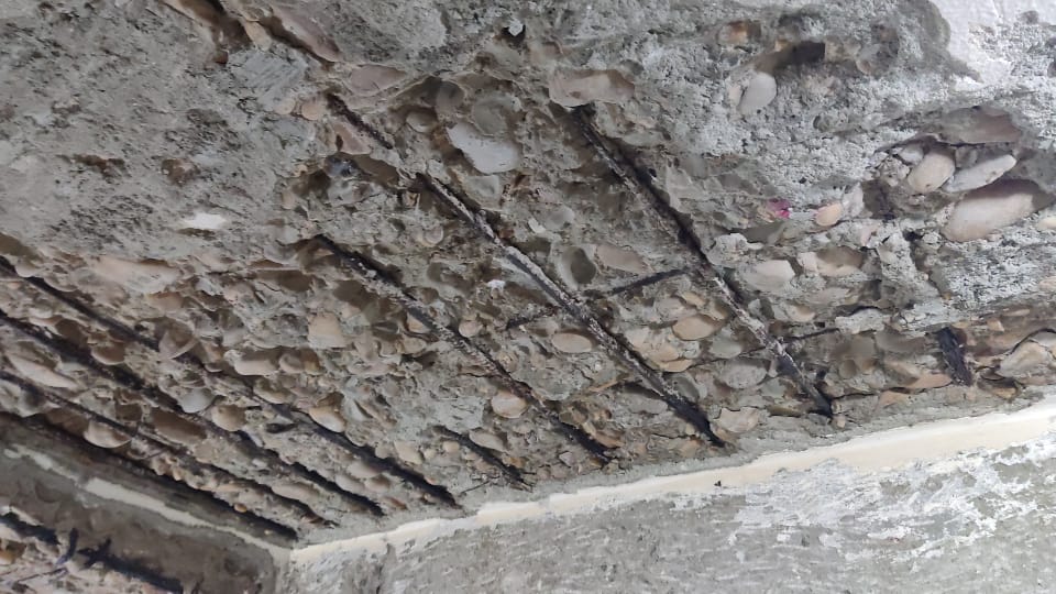 وهذا التجاوز هو السبب المباشر لظهور صدأ حديد التسليح بشكل واضح في البلاطات والكمرات والأعمدة وتكسر الغطاء الخرساني.