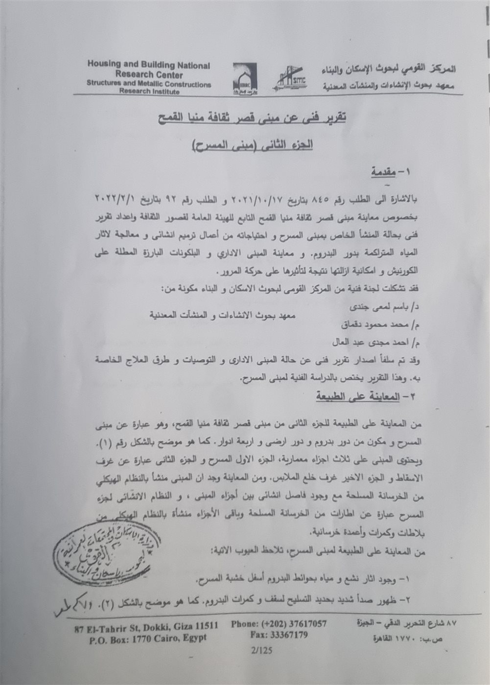 وتؤكد هذه الوثائق والبيانات الهندسية خطورة وضع المبنى الذي تبلغ مساحته 1300 متر مربع ويضم 4 منشآت رئيسية (إداري 5 طوابق، مسرح 750 كرسي، خدمي 4 طوابق، كبار زوار دورين).