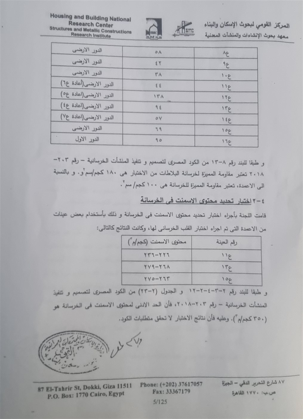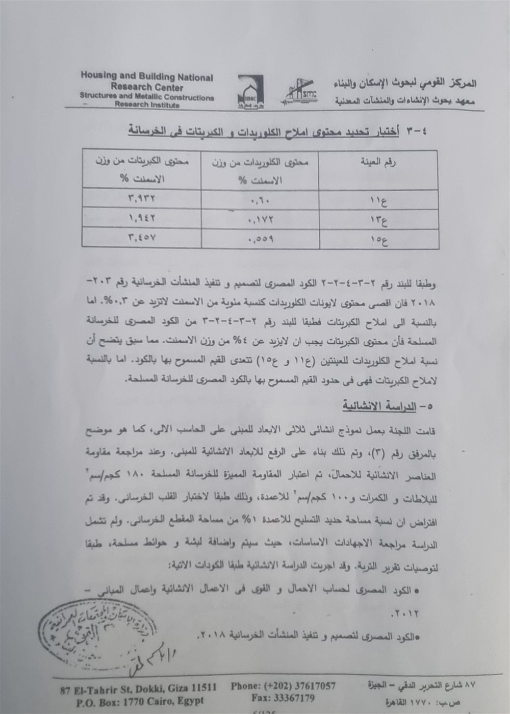 وتعد هذه الأرقام أقل من الحدود الدنيا المطلوبة في الكود المصري لتصميم وتنفيذ المنشآت الخرسانية رقم 203 لعام 2018 مما يجعل المبنى في حاجة ماسة لتدخل إنشائي جذري.