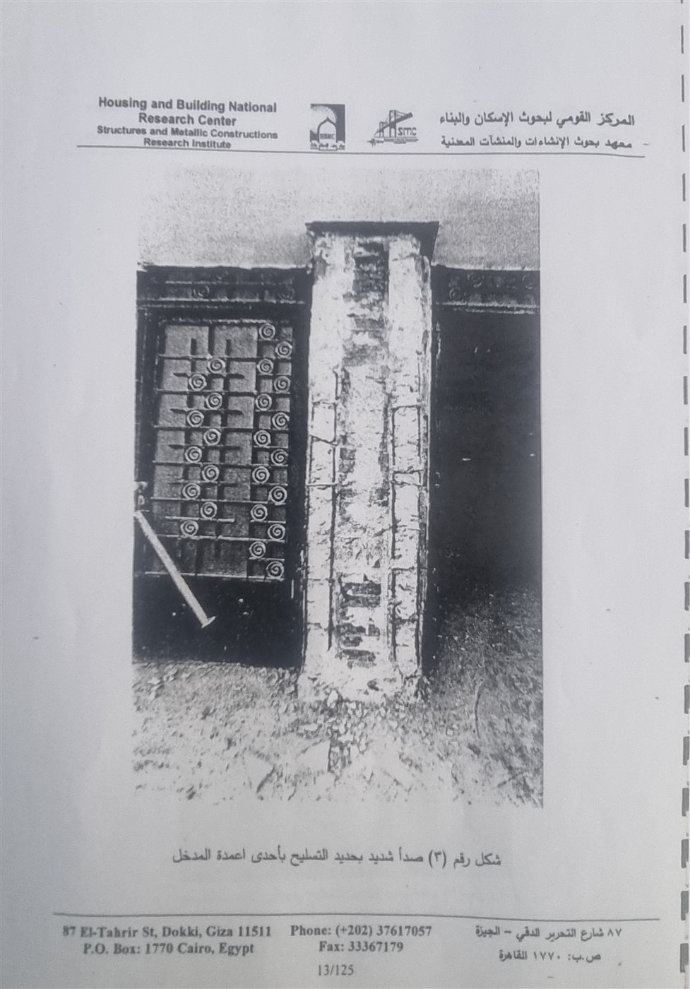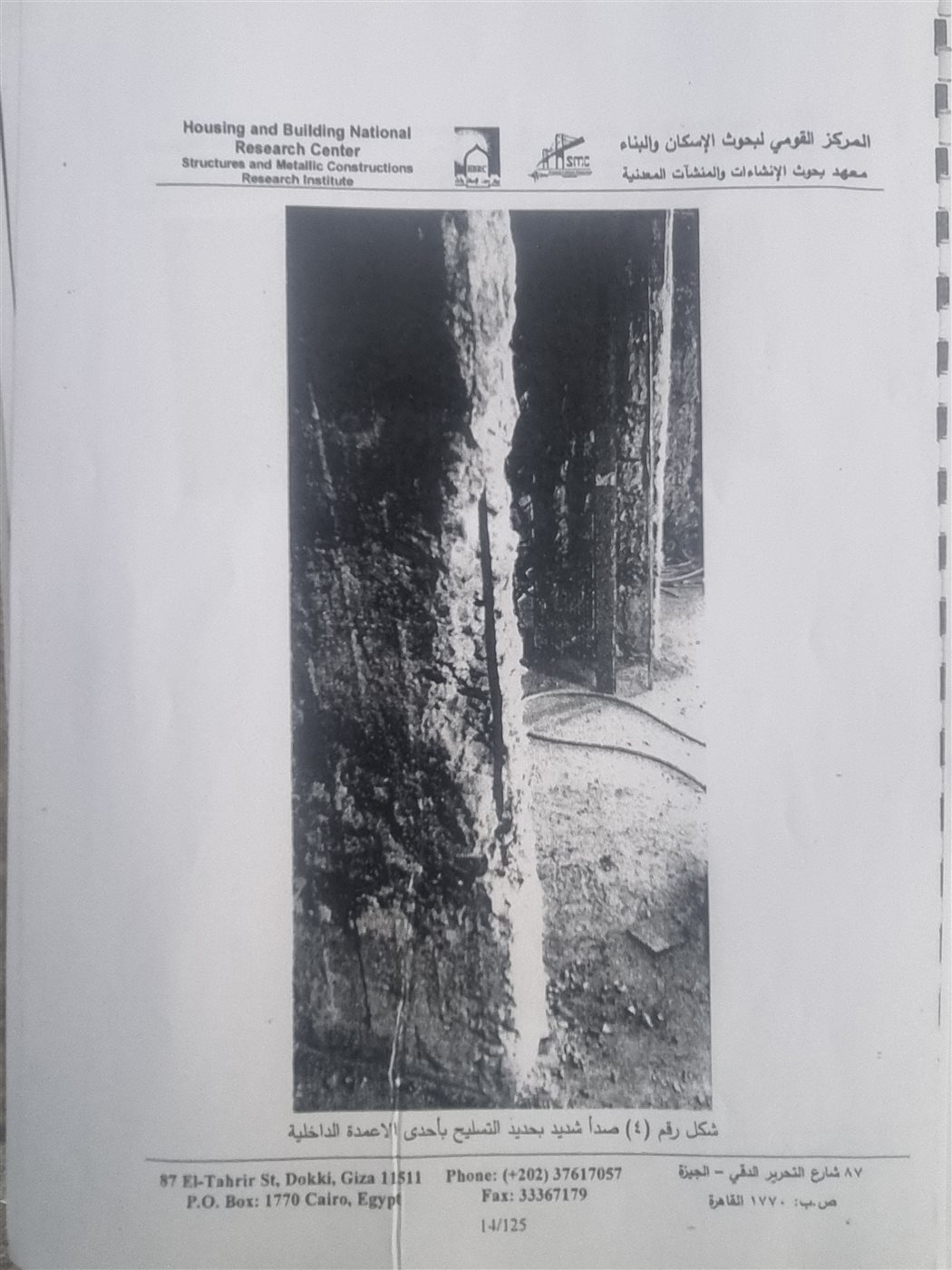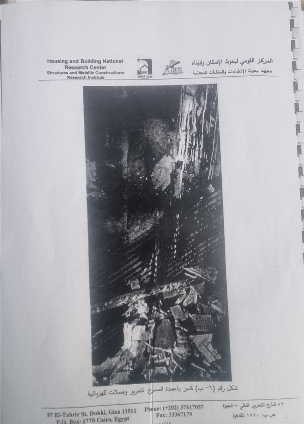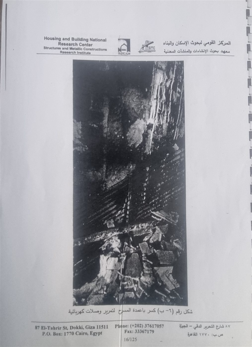 الوثائق الهندسية الصادرة من المركز القومي لبحوث الإسكان والبناء ممثلا في معهد بحوث الإنشاءات والمنشآت المعدنية ترصد تدهورا بنيويا غير مسبوق في العناصر الخرسانية المسلحة للمبنى.