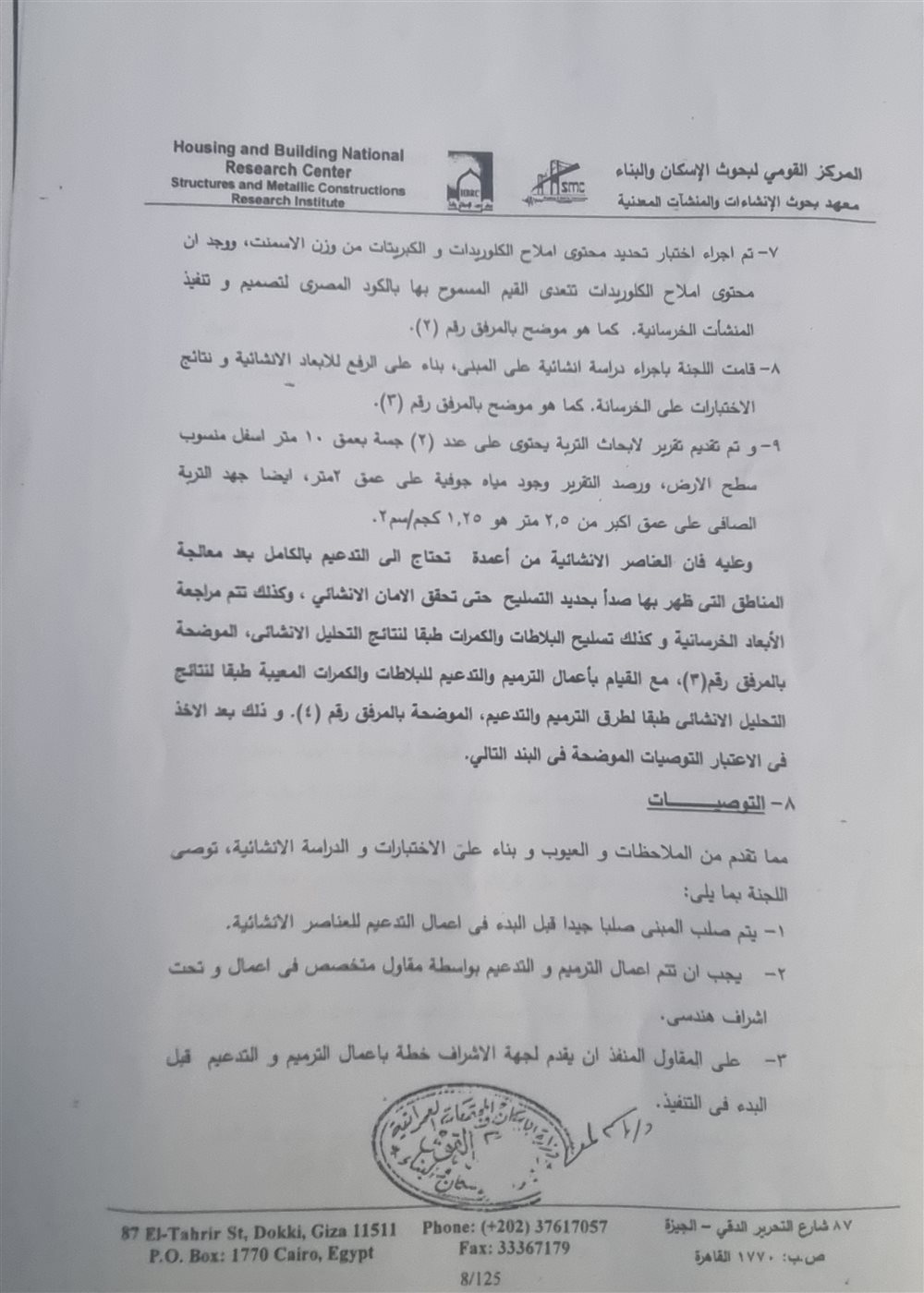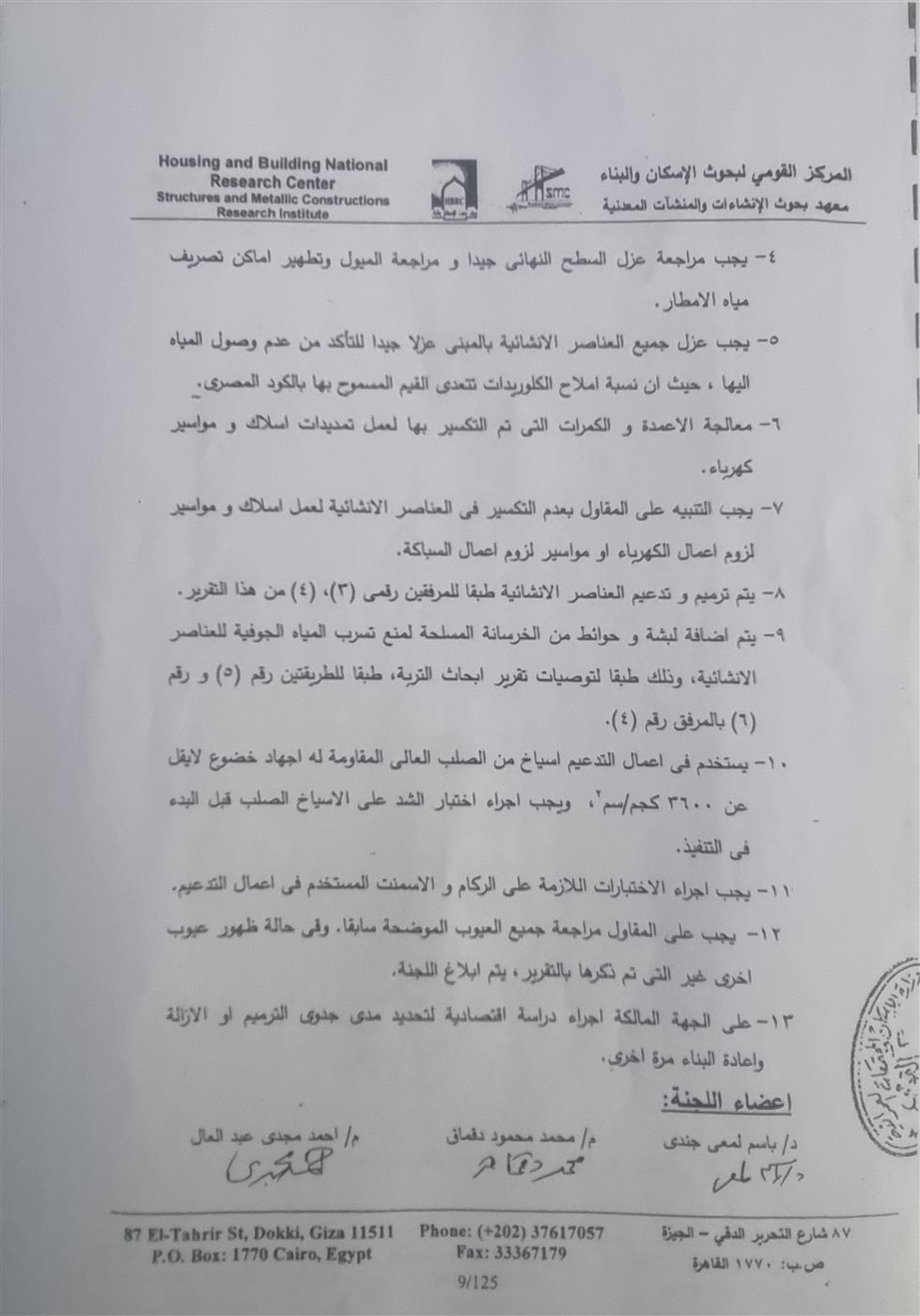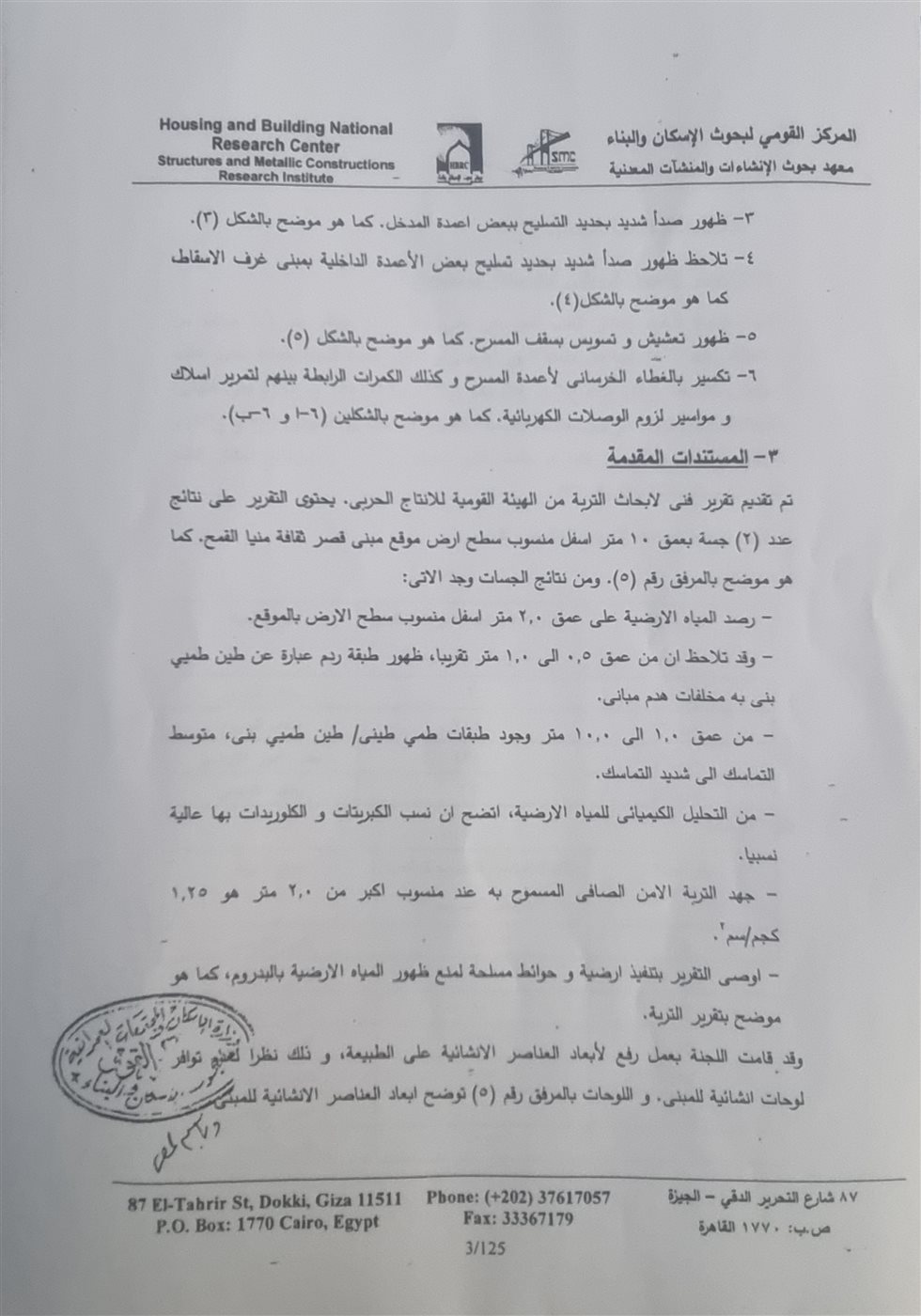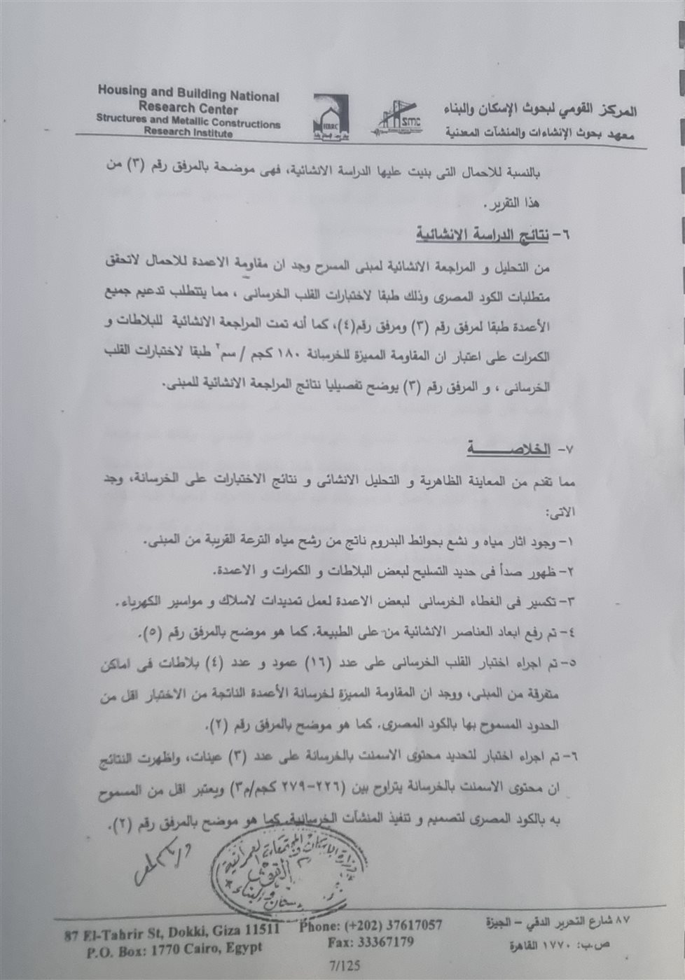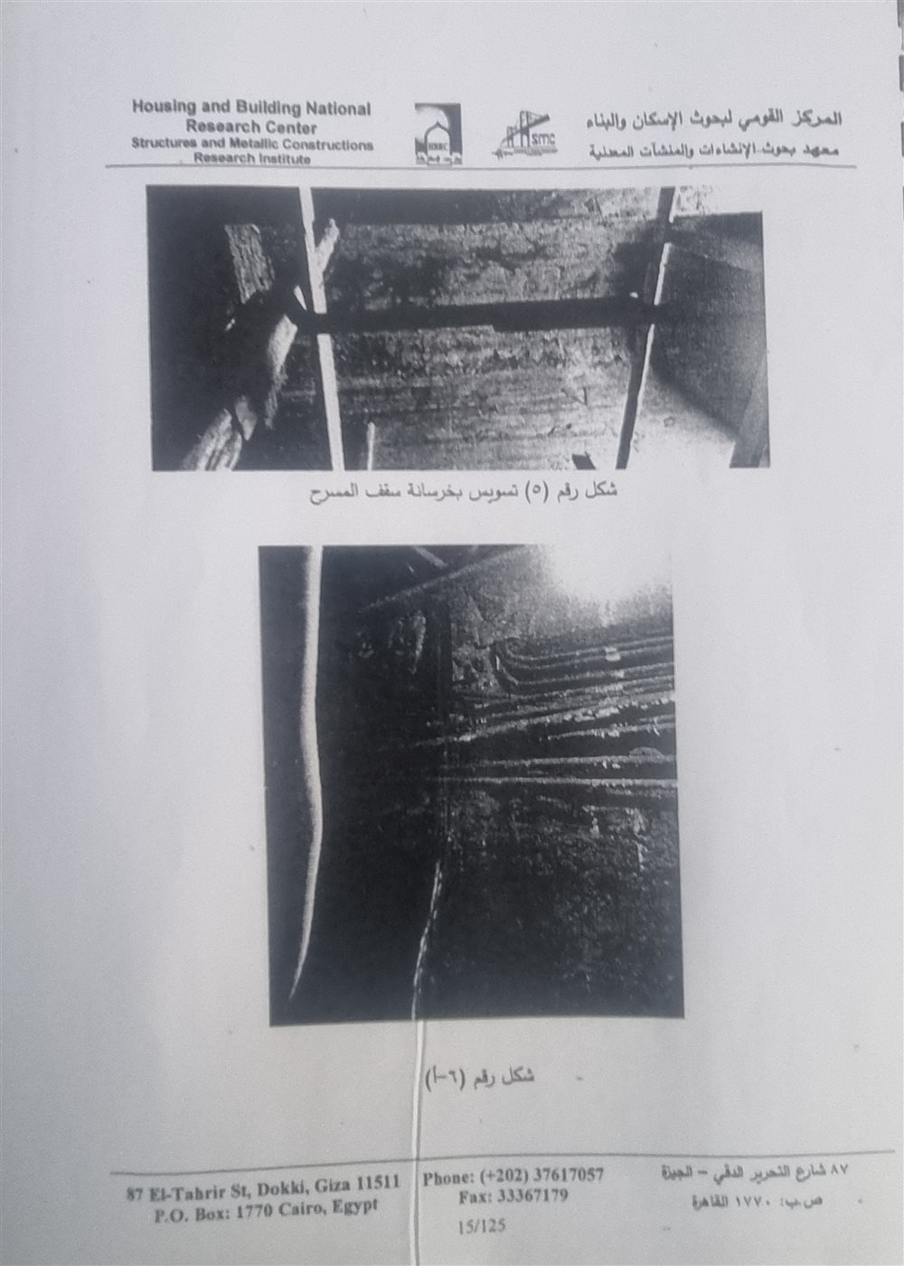 الوثائق الهندسية الصادرة من المركز القومي لبحوث الإسكان والبناء ممثلا في معهد بحوث الإنشاءات والمنشآت المعدنية ترصد تدهورا بنيويا غير مسبوق في العناصر الخرسانية المسلحة للمبنى.