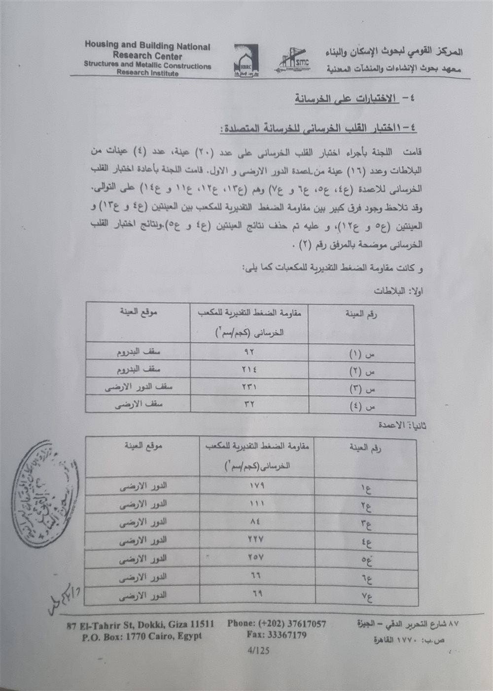 فقد أجرى فريق مختص اختبار القلب الخرساني على 20 عينة منها 16 عينة من أعمدة الدور الأرضي والأول و 4 عينات من البلاطات.