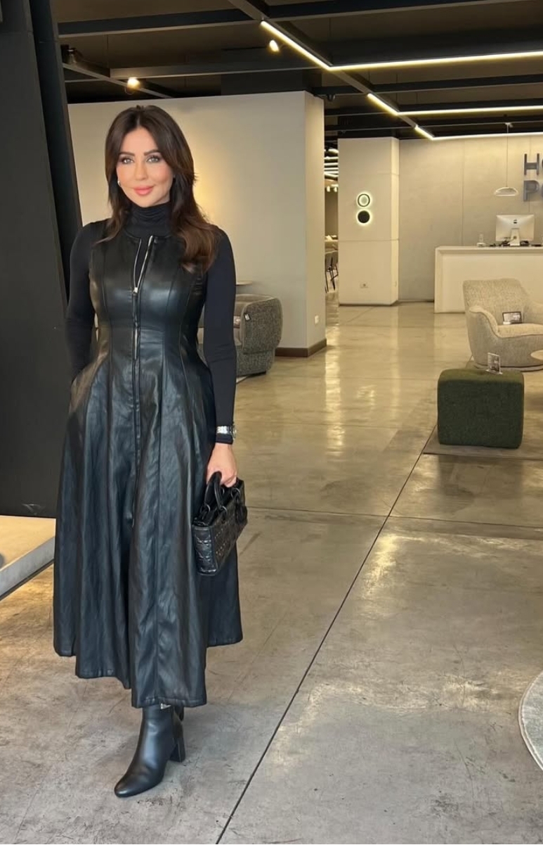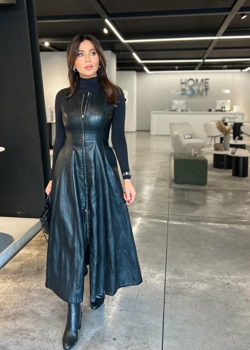 وبدت رابعة الزيات بإطلالة عصرية جذابة، مرتديه فستان طويل، صمم من قماش الجلد باللون الأسود، ونسقت عليه هاي كول، فيما انتعلت هاف بوت باللون الأسود.