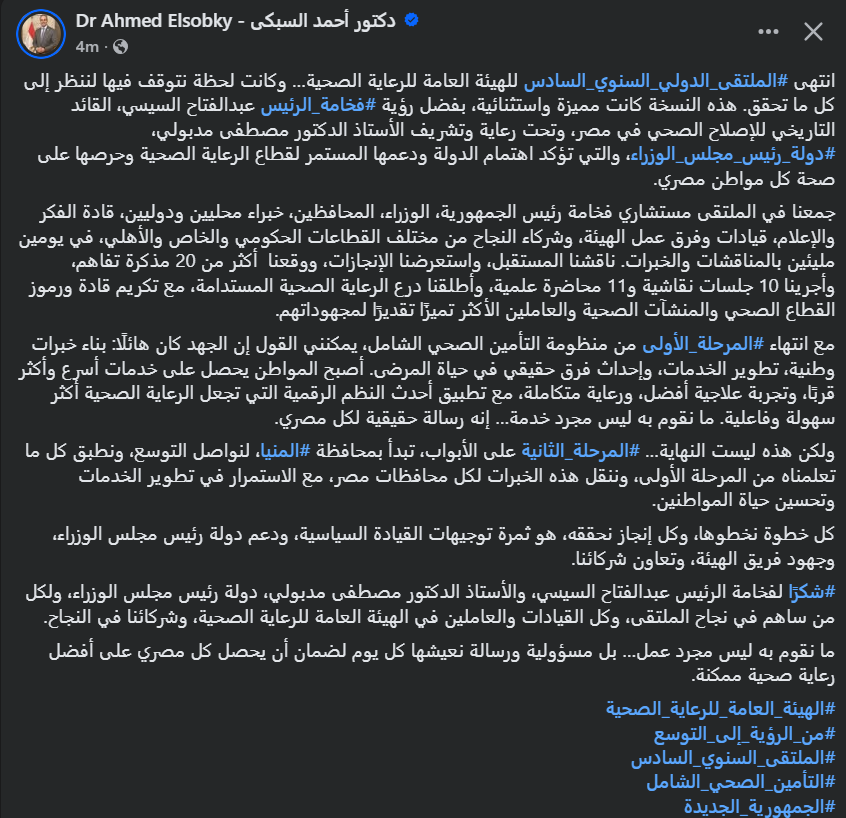 واختتم الدكتور أحمد السبكي رئيس الهيئة العامة للرعاية الصحية منشوره قائلًأ: “ما نقوم به ليس مجرد عمل… بل مسؤولية ورسالة نعيشها كل يوم لضمان أن يحصل كل مصري على أفضل رعاية صحية ممكنة”.