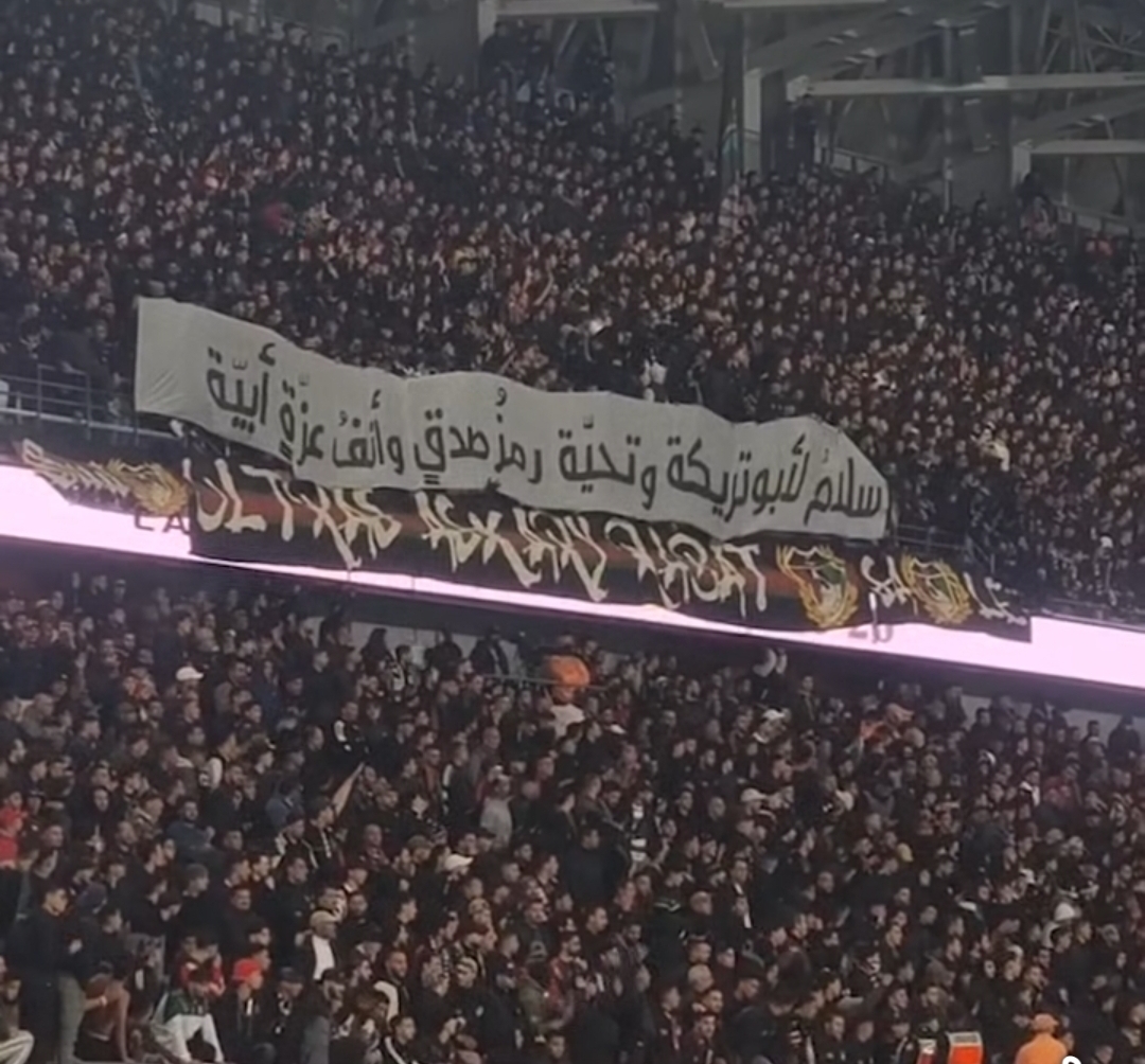 ورفع الآلاف من جماهير الفريق المغربي لافتة ضخمة كُتب عليها: "سلامٌ لأبو تريكة وتحيةٌ رمزَ صدقٍ وألفُ عزٍّ إليك"، وجاءت اللافتة خلال اللقاء، ضمن الجولة الثانية من دور المجموعات بدوري أبطال إفريقيا، وسط تفاعل كبير من الحاضرين في مدرجات ملعب مولاي الحسن.