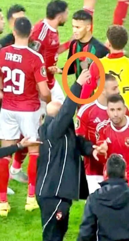 عقب إلغاء الهدف الثاني للجيش الملكي، اندفع لاعبو الفريق المغربي نحو لاعبي الأهلي والحكم في مشهد فوضوي، وشهدت اللقطات شدًا وجذبًا واحتكاكات بالأيدي، قبل أن يتدخل الجهازان الفنيان لاحتواء الموقف.