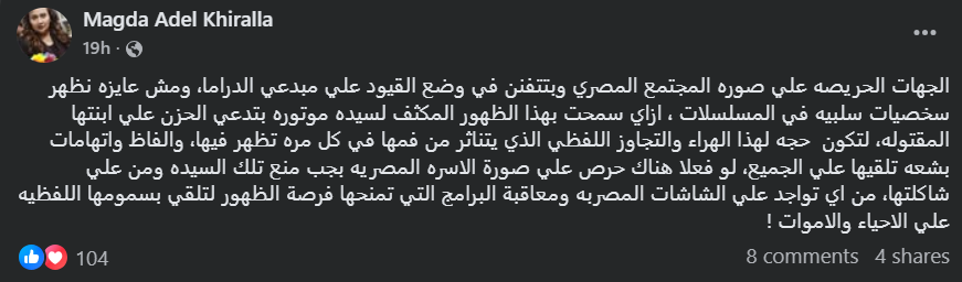 وكتبت ماجدة خير الله : “الجهات الحريصة علي صورة المجتمع المصري وبتتفنن في وضع القيود علي مبدعي الدراما، ومش عايزه نظهر شخصيات سلبية في المسلسلات ، ازاي سمحت بهذا الظهور المكثف لسيده موتوره بتدعي الحزن علي ابنتها المقتوله”.