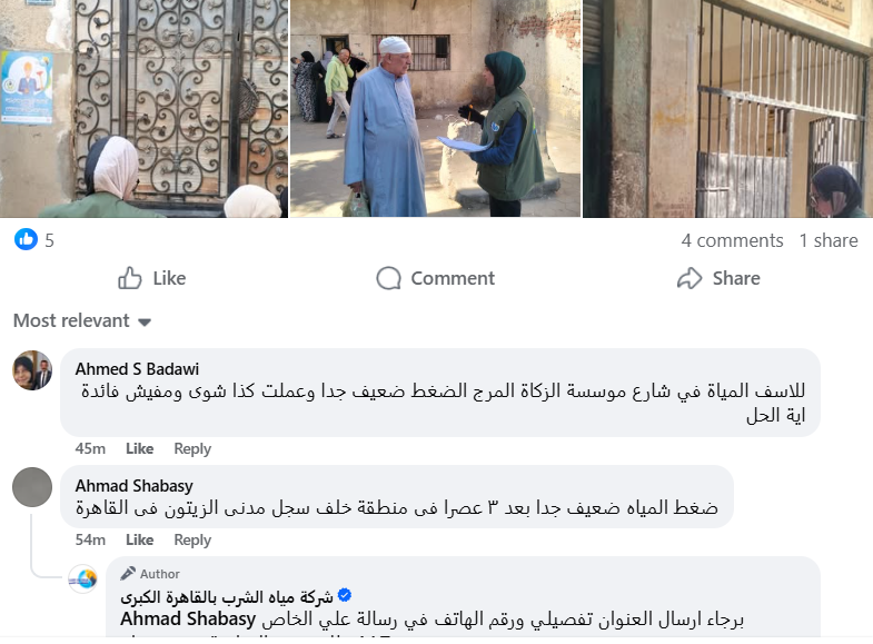 وقال أخر:"ضغط المياه ضعيف جدًا بعد ٣ عصرا فى منطقة خلف سجل مدني الزيتون في القاهرة"، لترد عليه الشركة بطلب عنوانه ووسيلة تواصل حيث قالت :"برجاء ارسال العنوان تفصيلي ورقم الهاتف في رسالة علي الخاص للفحص والمتابعة مع حضرتك".