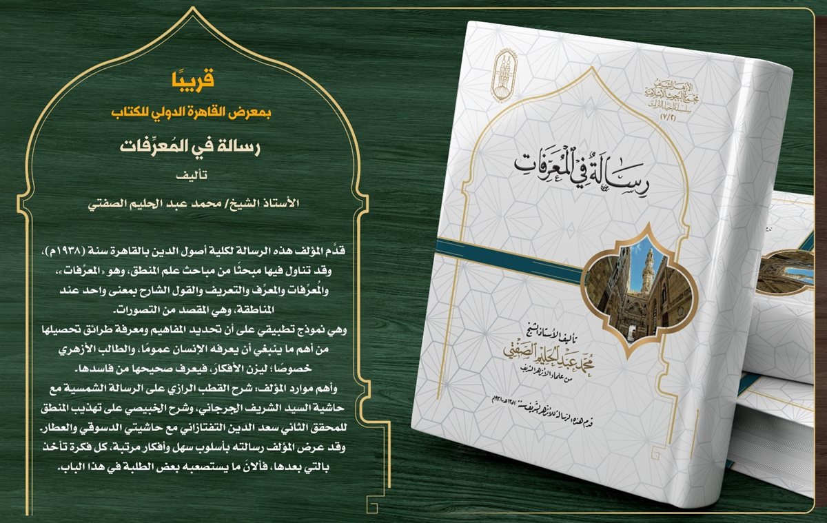 يُقدَّم مجمع البحوث الإسلامية بالأزهر الشريف قريبًا بمعرض القاهرة الدولي للكتاب كتاب “المعرّفات” للأستاذ الشيخ محمد عبد الحليم الصفتي، الذي قدَّمه المؤلّف لكلية أصول الدين بالقاهرة عام 1938م، حيث تناول فيه مبحثًا مهمًا من مباحث علم المنطق، وهو موضوع المعرّفات، والمعرّف والتعريف، والقول الشارح بمعنى واحد عند المناطقة، باعتبارها المقصد الأساسي من التصورات المنطقية.