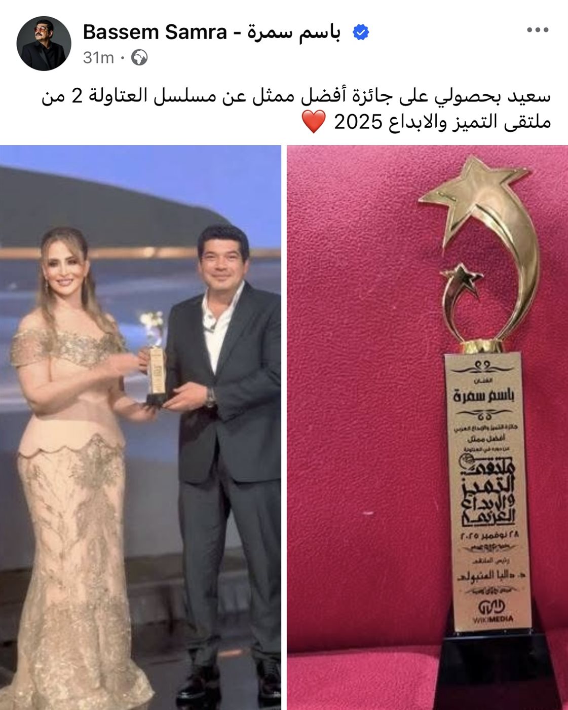 علق باسم سمرة على الصور قائلاً: “سعيد بحصولي على جائزة أفضل ممثل عن مسلسل العتاولة 2 من ملتقى التميز والإبداع 2025”، مؤكّدًا أن التكريم جاء تقديرًا لأدائه في العمل.