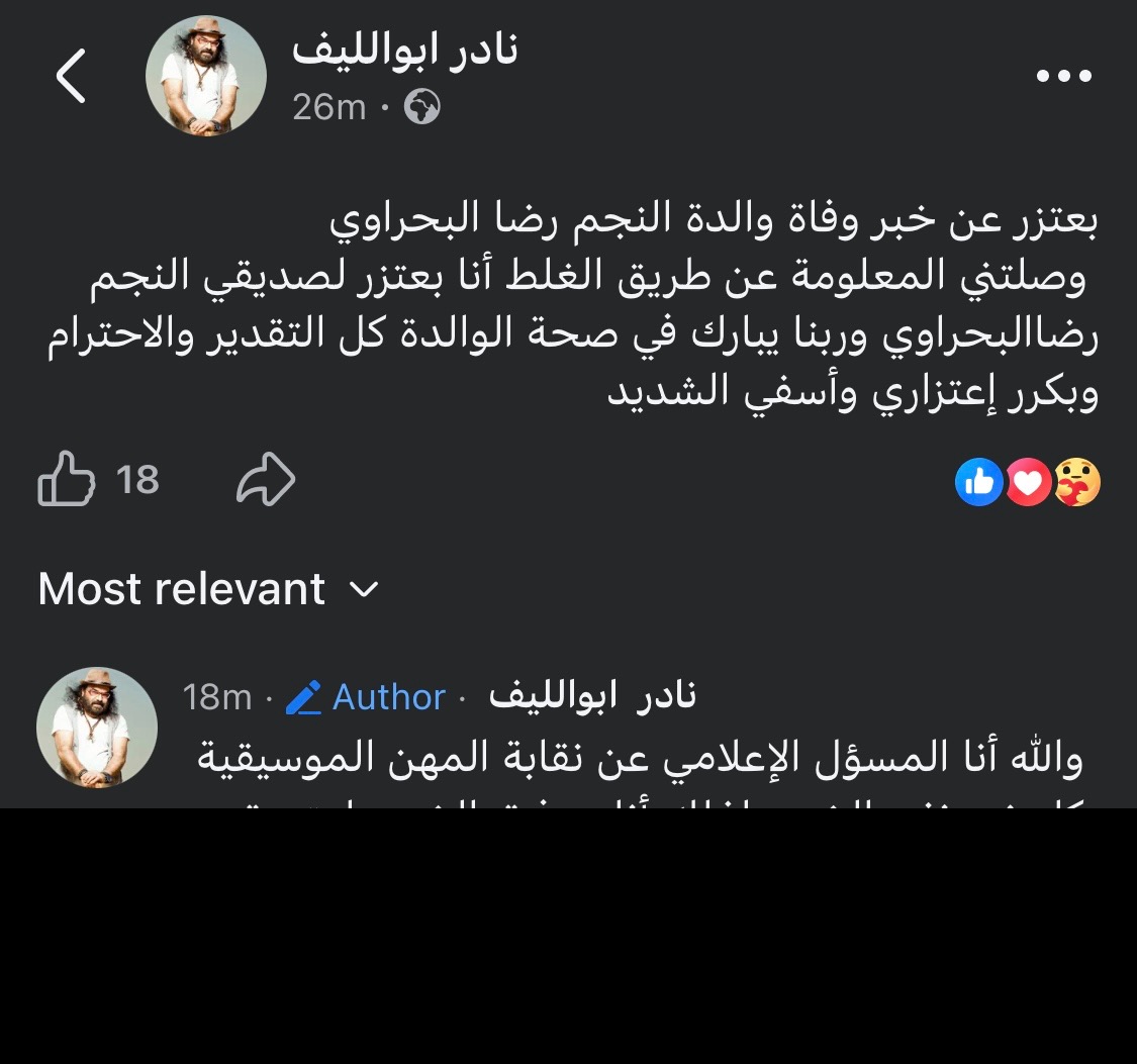 حذف نادر أبو الليف منشور النعي، ونشر منشور آخر ليوضح به الأمر قائلًا: "بعتذر عن خبر وفاة والدة النجم رضا البحراوي.. وصلتني المعلومة عن طريق الغلط أنا بتعذر لصديقي النجم رضا البحراوي وربنا يبارك في صحة الوالدة كل التقدير والاحترام وبكرر اعتذاري وأسفي الشديد".